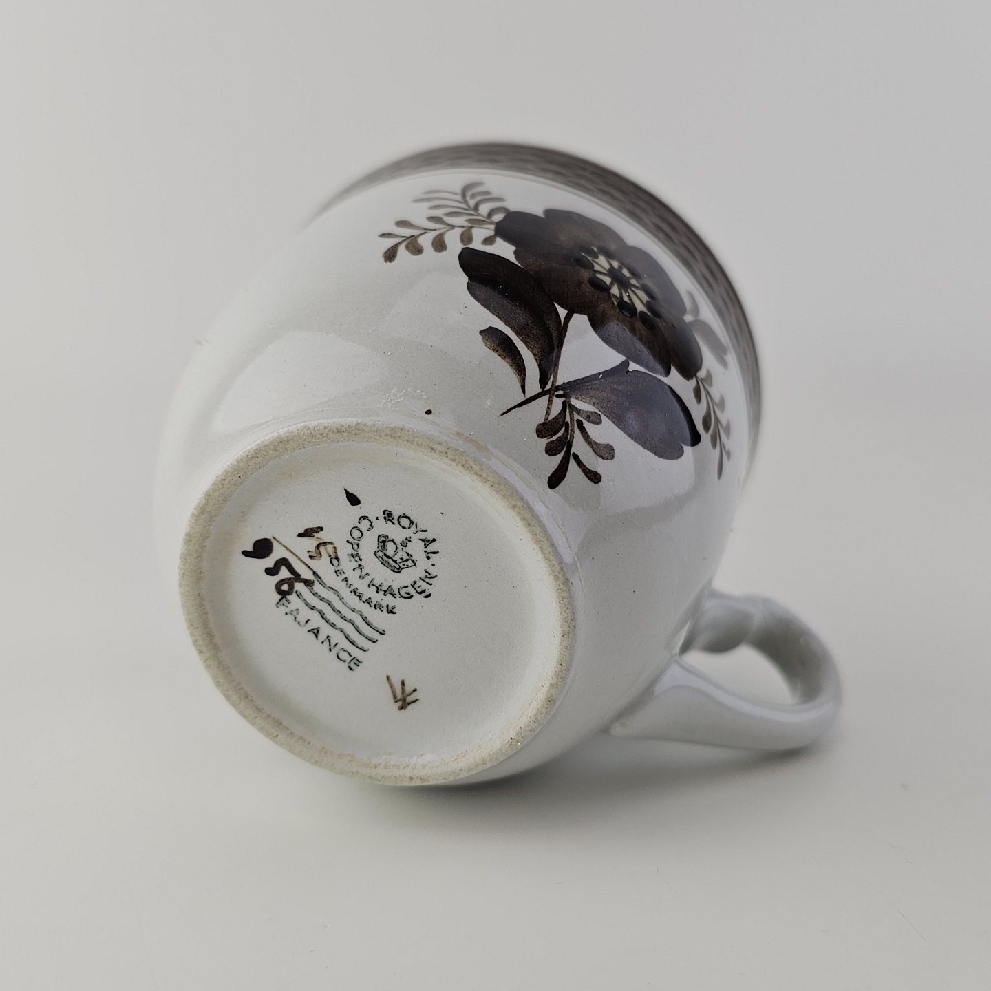 Kop med underkop i fajance fra stellet Brun Tranquebar fra år 1919