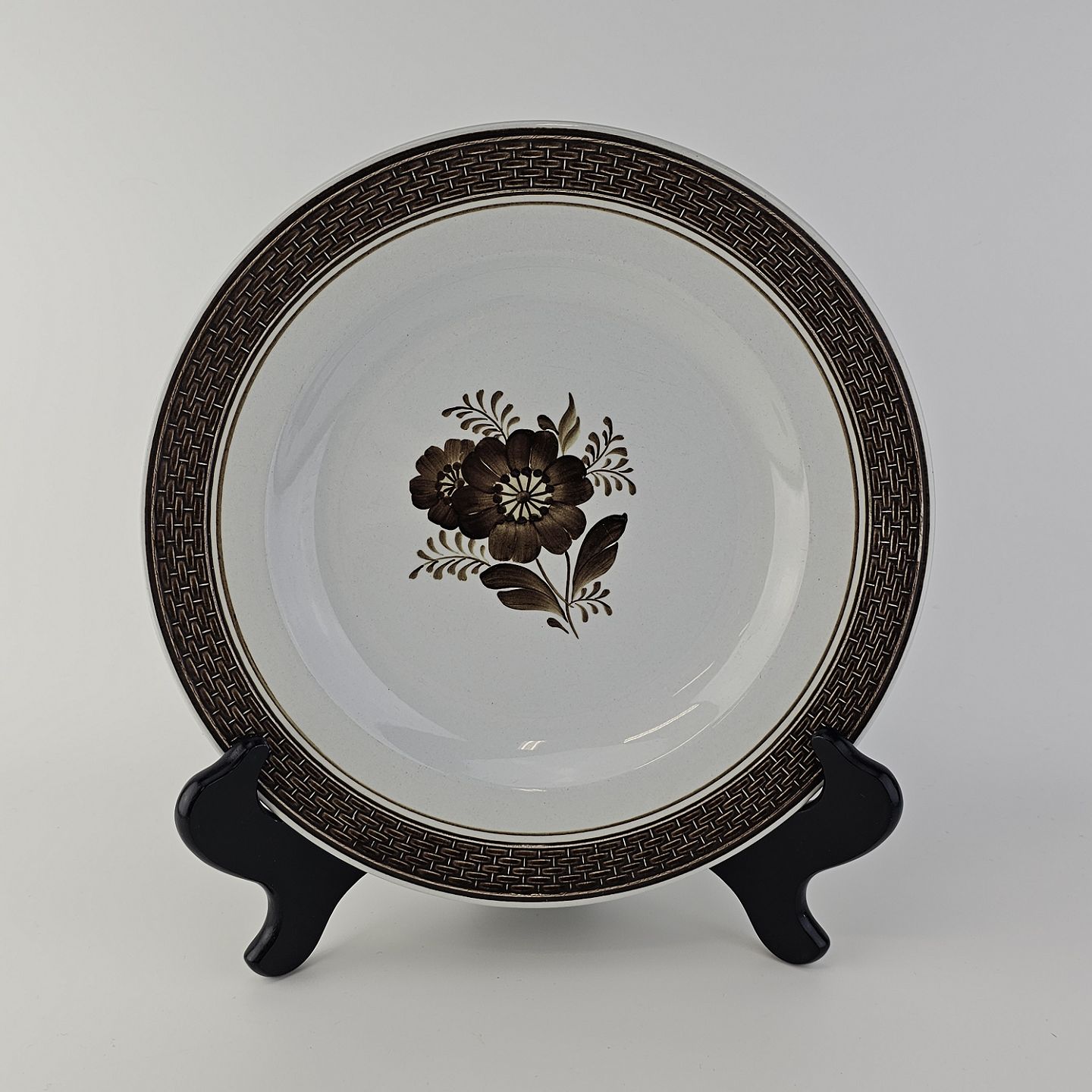 Fajancestellet med flettet kant og dekoration af brune blomster på lys baggrund med brun kant