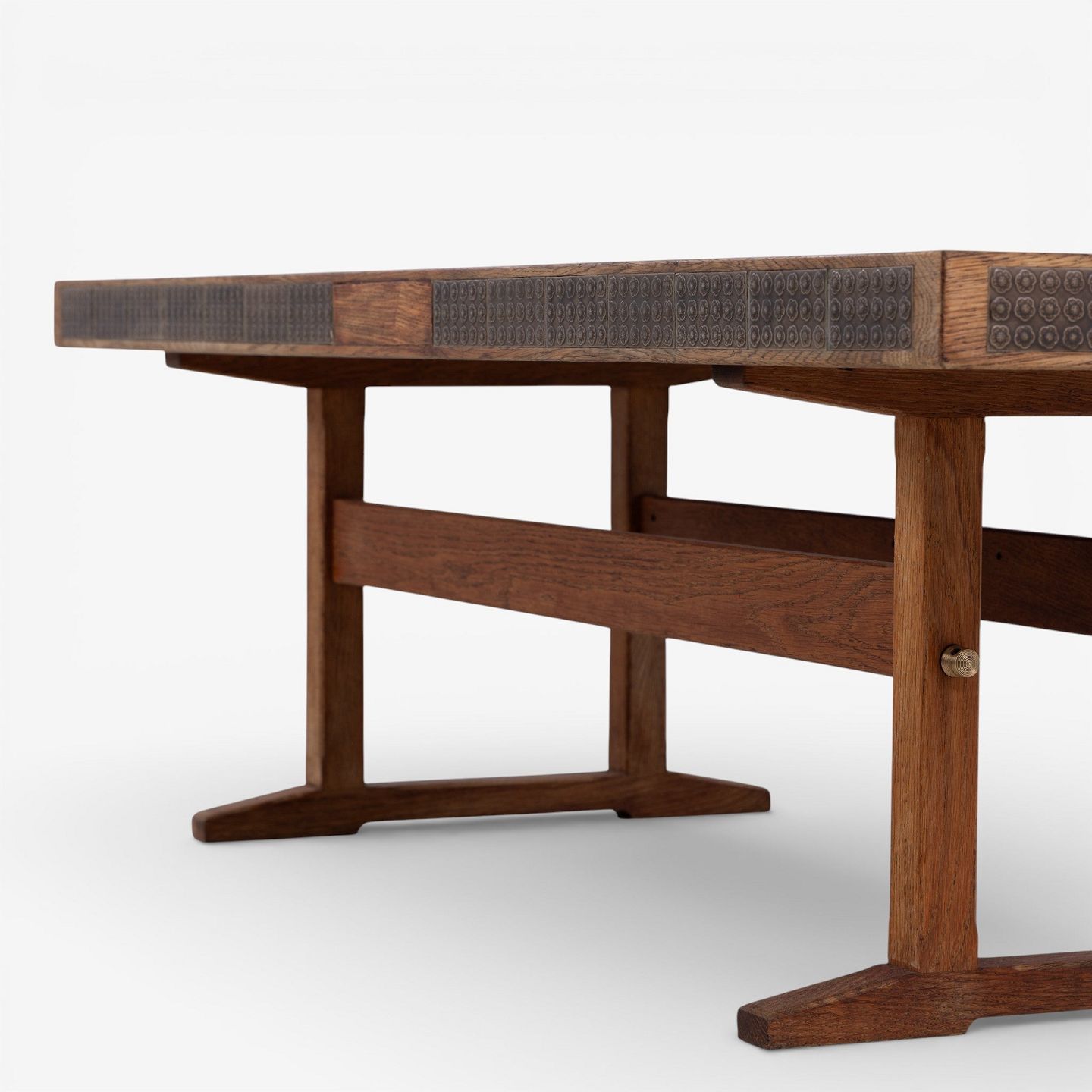Sofabord i patineret egetræ dekoreret med brune kakler. Stemplet fra producent.