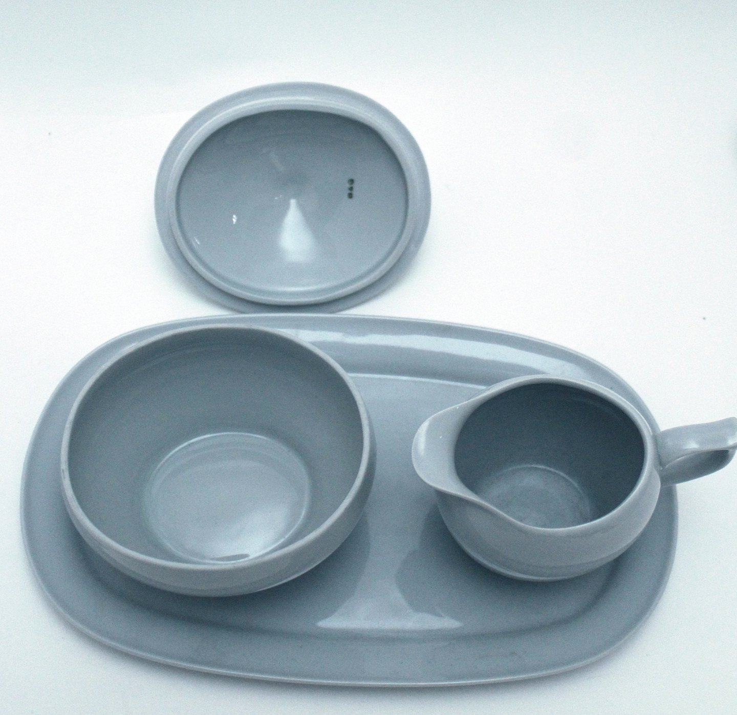 Text zugänglich auf Dänische: Bing & Grøndahl, Leda, Sart lysegrå/lyseblå stel. Sukker og flødesæt på bakke. Farven snyder meget, på billederne ser det lyseblåt ud og alt efter lyset ser det gråt ud.