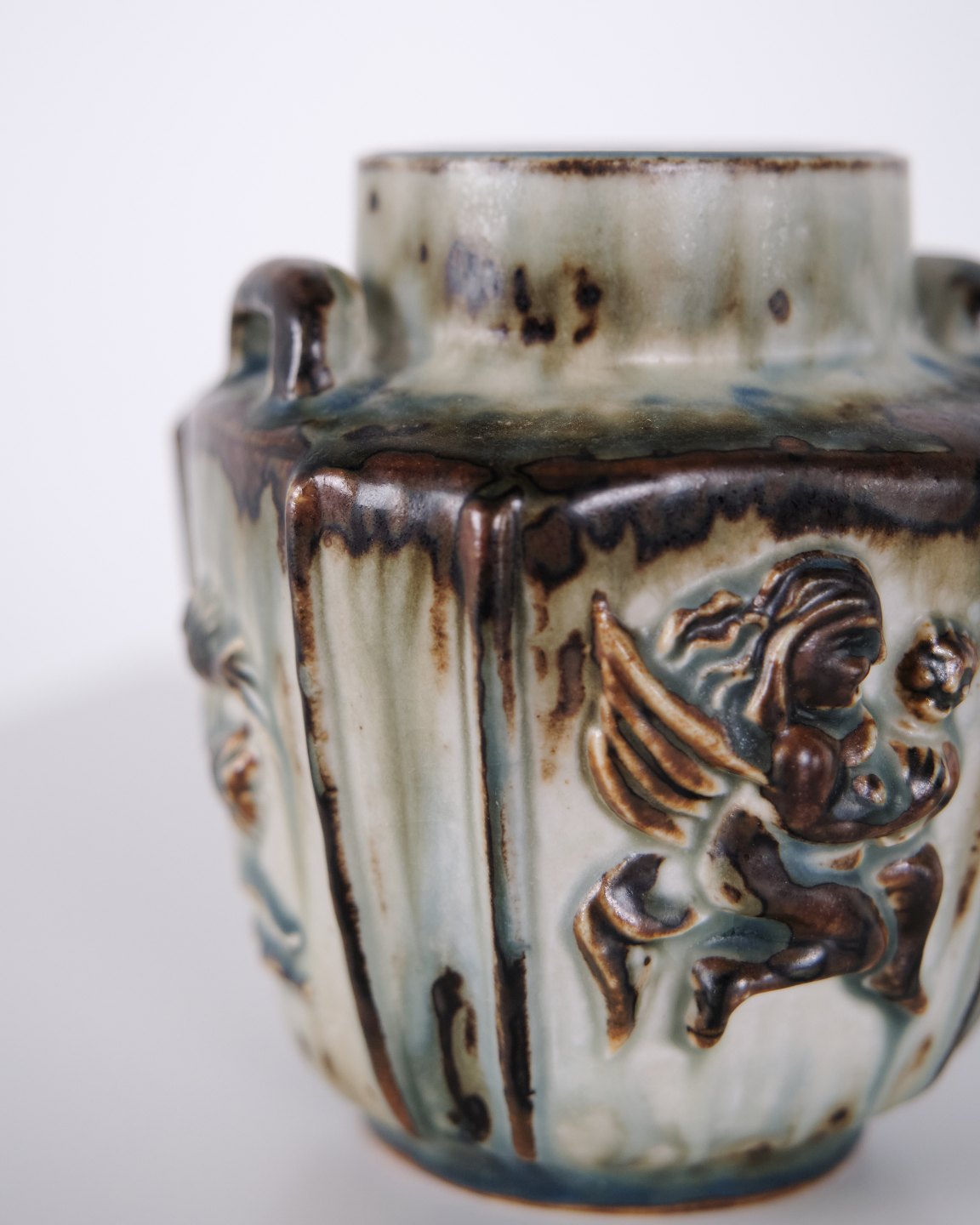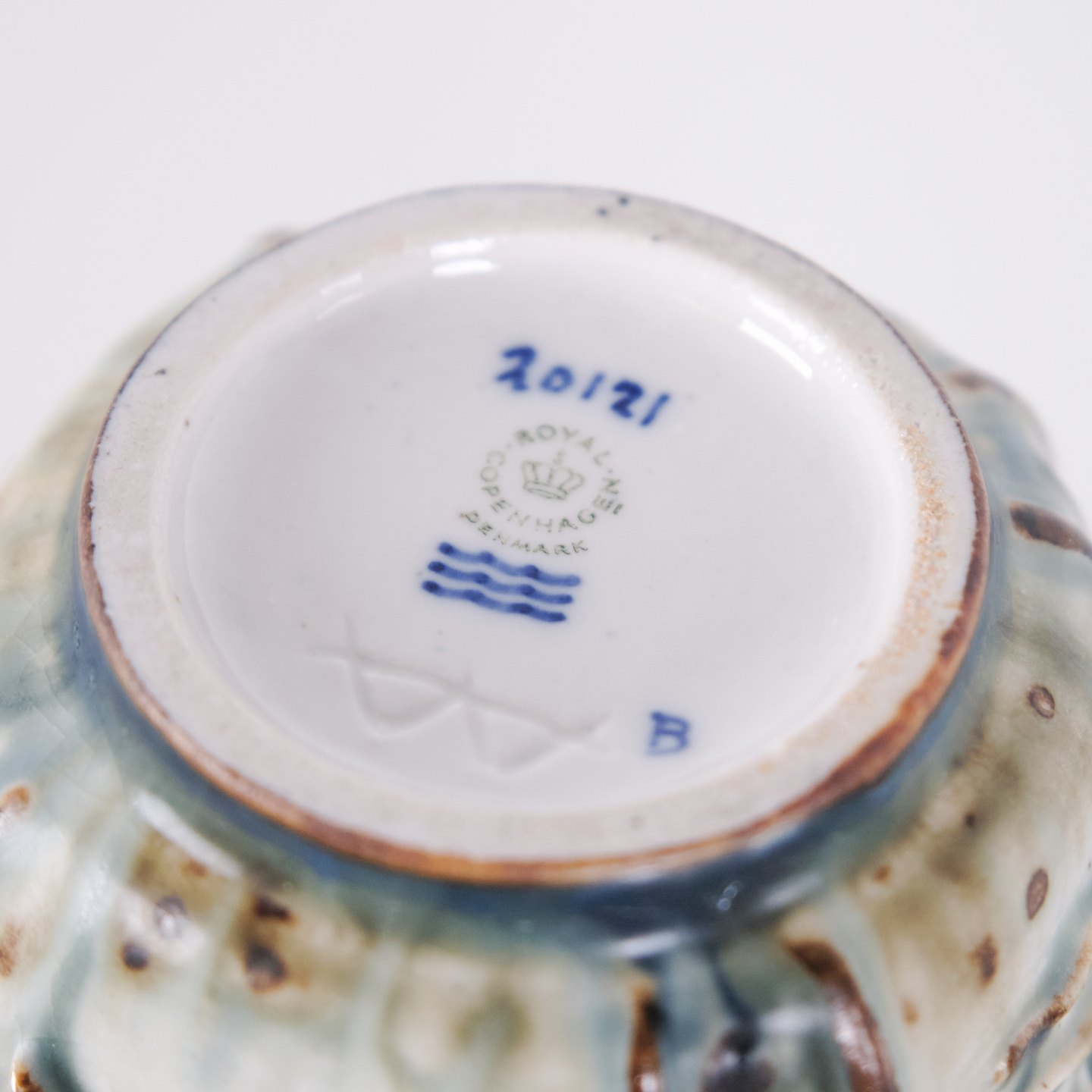 Steinzeugvase, entworfen von Bode Willumsen für Royal Copenhagen. Die Vase ist mit Reliefmotiven modelliert und wurde in Dänemark in den Jahren 1969 bis 1973 bei Royal Copenhagen hergestellt. Signiert mit Monogramm und Modellnummer 20121. Ein Beispiel für dänisches Keramikdesign des späten 20. Jahrhunderts.