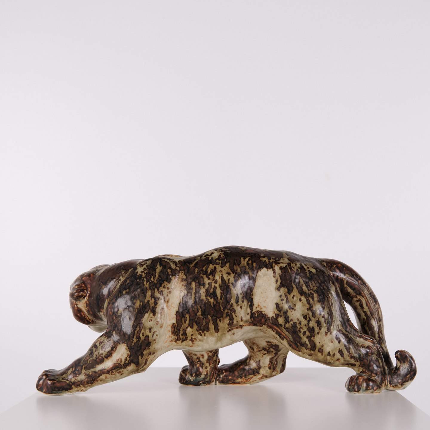 Steinzeugfigur mit Panthermotiv, Modell 20283, entworfen von Knud Kyhn für Royal Copenhagen. Die Figur wurde aus Steinzeug gefertigt und gehört zu Knud Kyhns Tierdarstellungen, die bei Royal Copenhagen produziert wurden und dem dänischen Keramikdesign des 20. Jahrhunderts zuzuordnen sind.