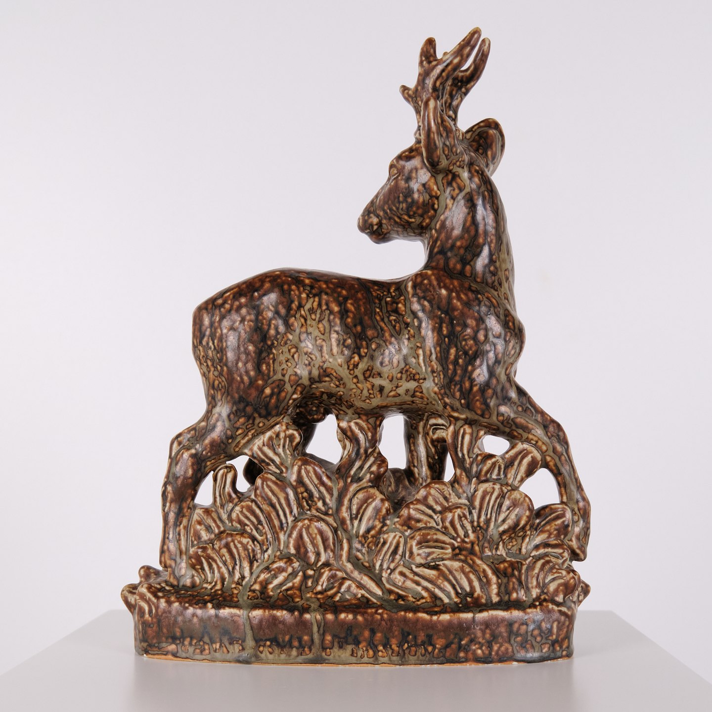 Steinzeugfigur mit Motiv eines stehenden Hirsches, Modell Nr. 21333, entworfen von Knud Kyhn für Royal Copenhagen. Die Figur ist aus Steinzeug gefertigt und Teil von Knud Kyhns Tierdarstellungen, die bei Royal Copenhagen in der Mitte des 20. Jahrhunderts produziert wurden.