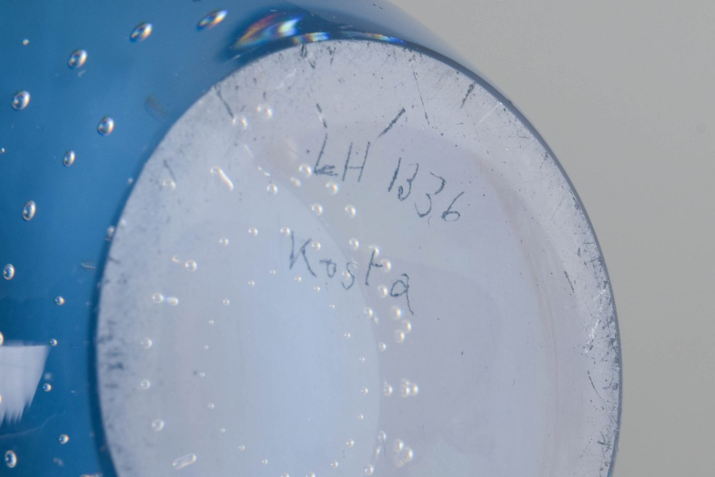 Slank vase i blåt kunstglas med dekorativt boblemønster og optisk ribning; indridset i bunden “LH 1336 / Kosta”.