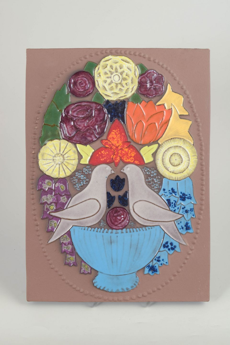 Farverigt keramisk vægrelief med stiliseret blomsterbuket og to fugle i relief. Modelnr. 01945.