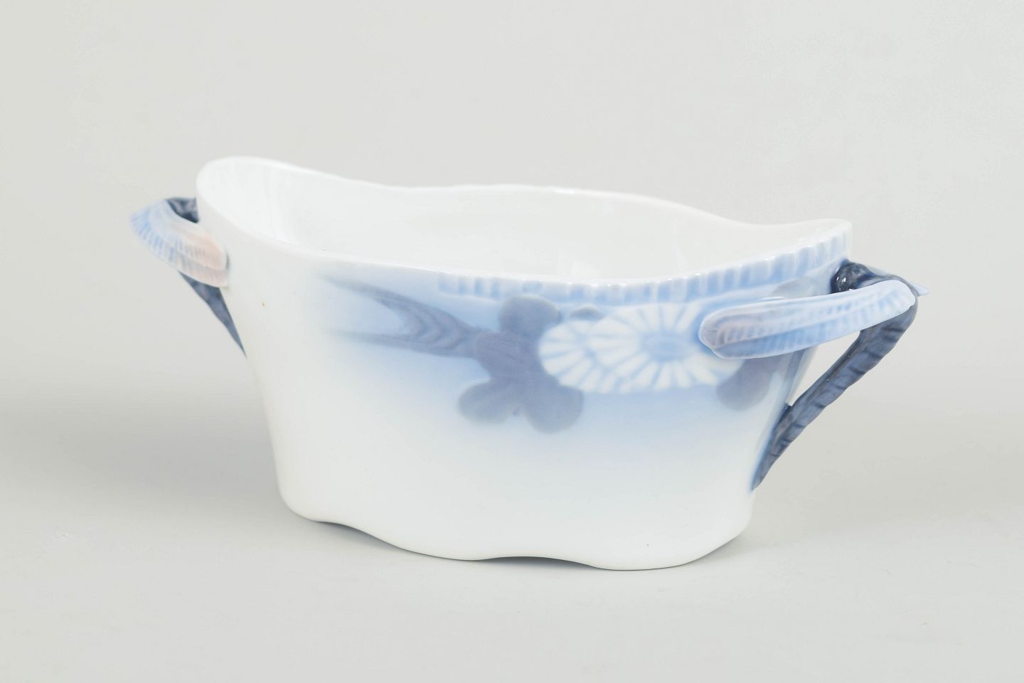 Lille åben porcelænsskål med to hanke og blå underglasurdekoration i serien Skærsommernatsdrøm.