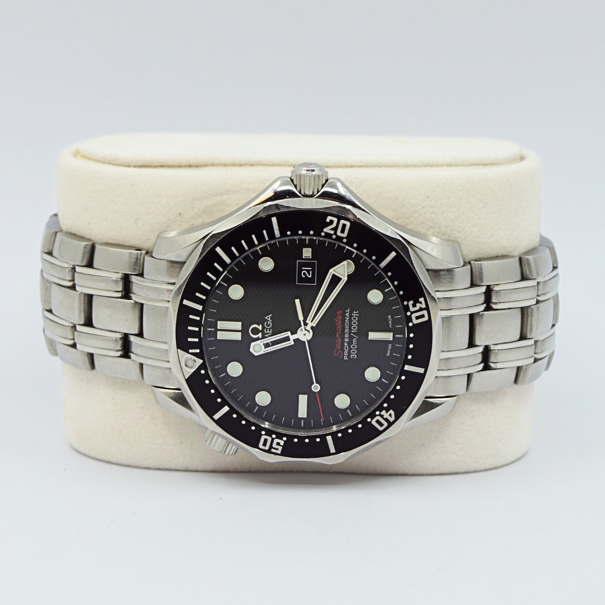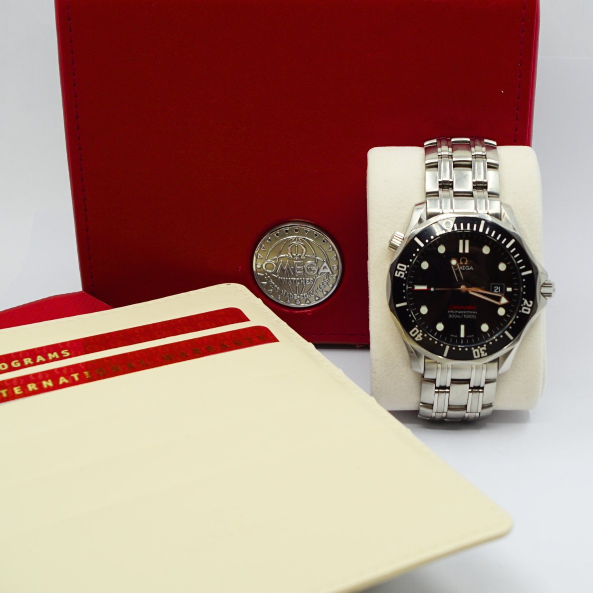 Text zugänglich auf Dänische: Omega armbåndsur, model Seamaster Professionel 300m/1000ft, med sort urskive og stål rem. Ref. 21230416101001. Cal: 1538. Automatic. Omega herreur, købt fra ny d. 10/09/08. Diameter 42 mm. Med original æske og papirer. Ekstra led medfølger.