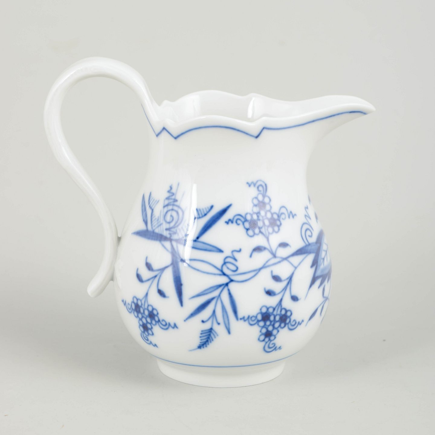 Klassisk flødekande i porcelæn dekoreret i underglasurblåt med blå Løgmønster og bølget kant.