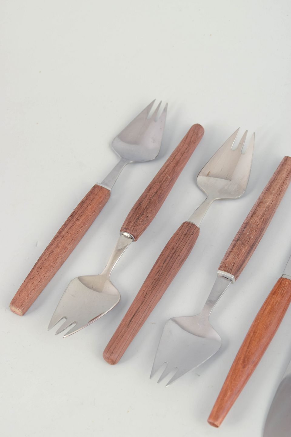 Skandinavisk bestikdesign i 1960’erne var præget af rene linjer og funktionel enkelhed, hvor varme naturmaterialer som træ blev kombineret med rustfrit stål. Udtrykket er tidstypisk modernistisk og velegnet til både daglig brug og borddækning i vintage-stil.