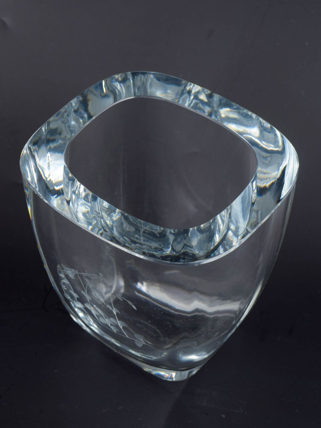 Kraftig, mundblæst glasvase med blødt afrundet, kvadratisk grundform og tyk, klar kant. Bærer en svagt ætset mærkning “KABI” i bunden.