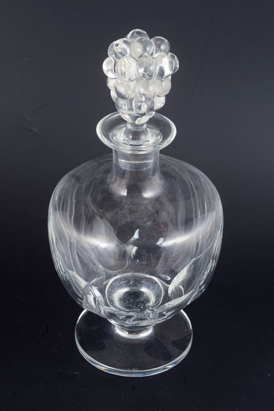 Stor og sjælden vinkaraffel i klart formpresset glas med reliefsleben korpus og knop formet som drueklase. Modellen “Clos Vougeot” er udført med klassisk Art Deco-inspireret symmetri og elegante facetter, der reflekterer lyset og fremhæver glassets klarhed. Signeret i bunden.