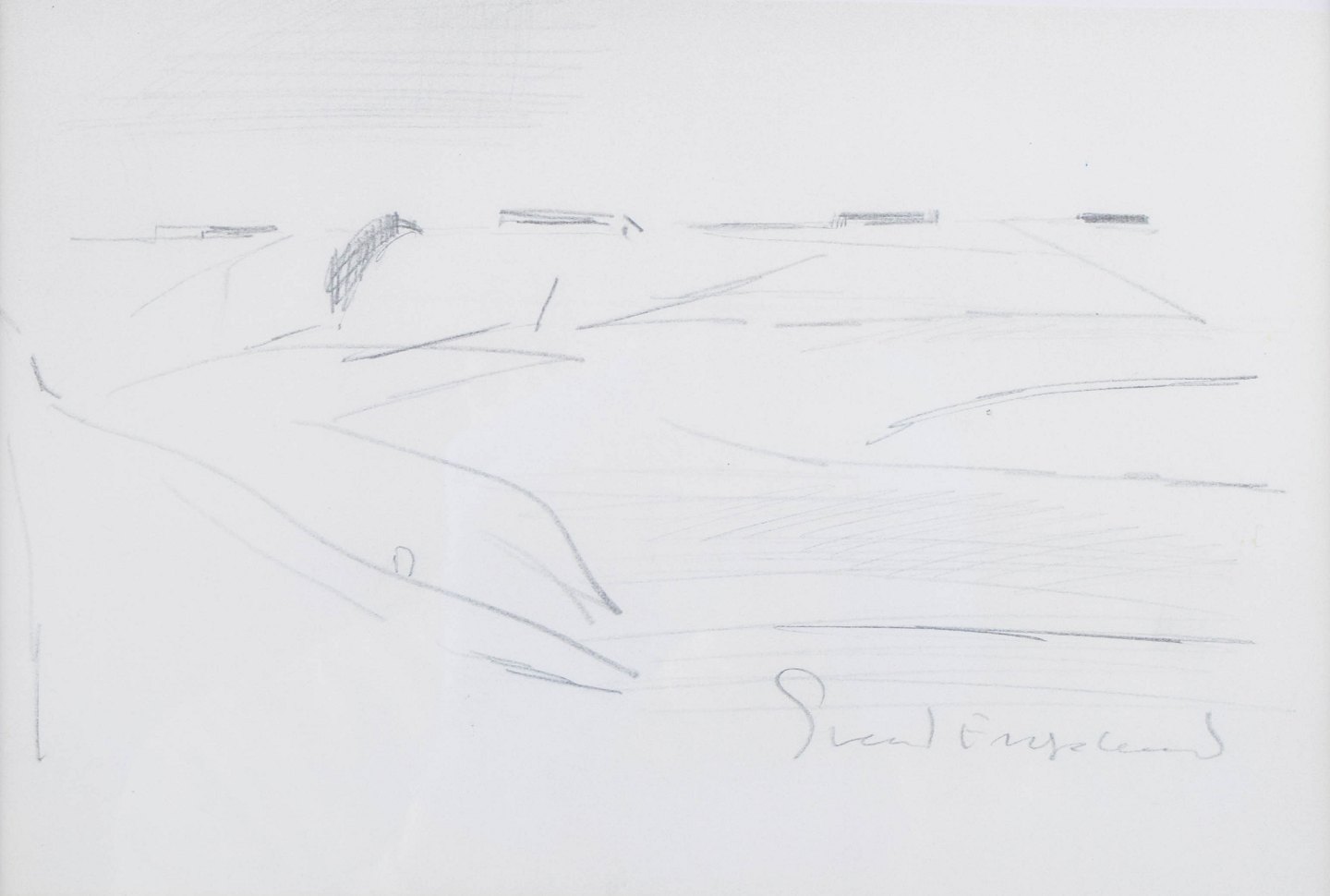 Dansk landskabsmotiv udført som blyantstegning med let abstraheret komposition og rolige, horisontale linjer.