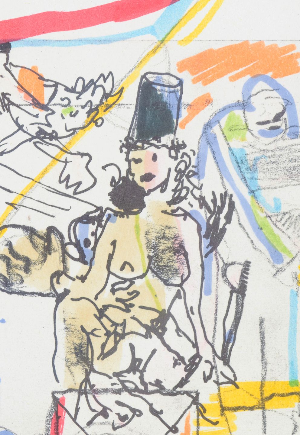 Abstrakt og figurativt sammensat motiv med ekspressive linjer og farvefelter, udført i blandteknik på papir. Kompositionen kombinerer skitseprægede figurer med geometriske former og transparente farvelag. Signeret.
