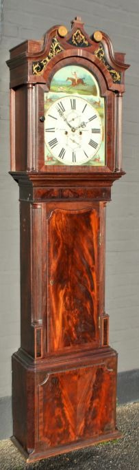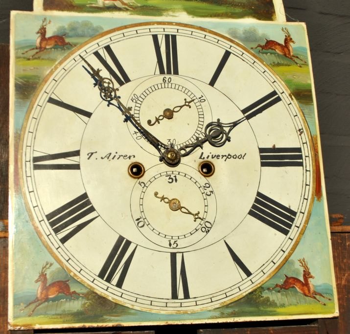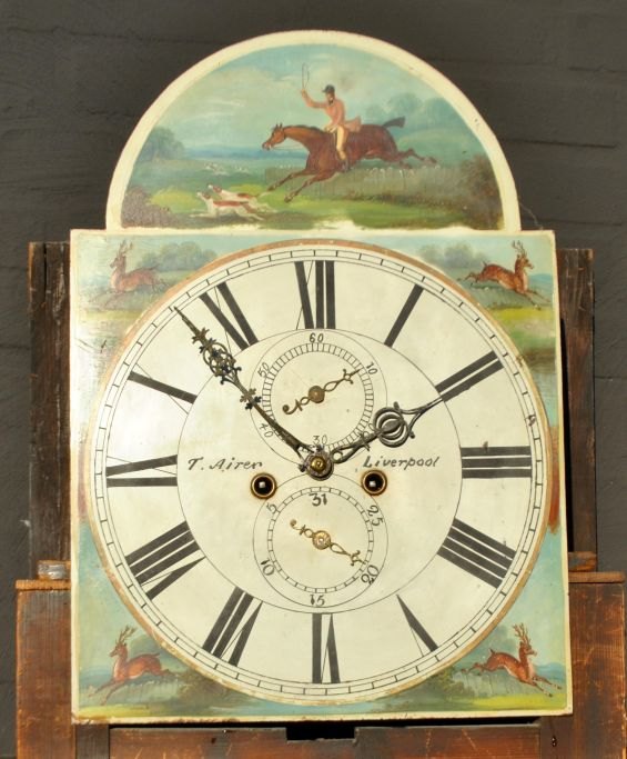 T. Airer, 18. Jahrhundert. Liverpool, England: Standuhr im Stil Ludwigs XVI. Mahagoni mit Viertelsäulen und Schwanenkopf. Bemaltes Zifferblatt mit Jagdszene und Tieren. Bemaltes Glas auf der Oberseite. Höhe: 225 cm. Breite: 55 cm. Tiefe: 25 cm.