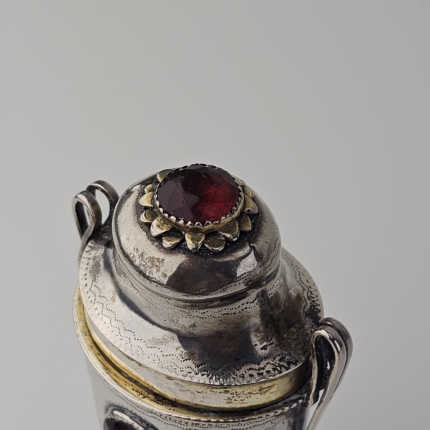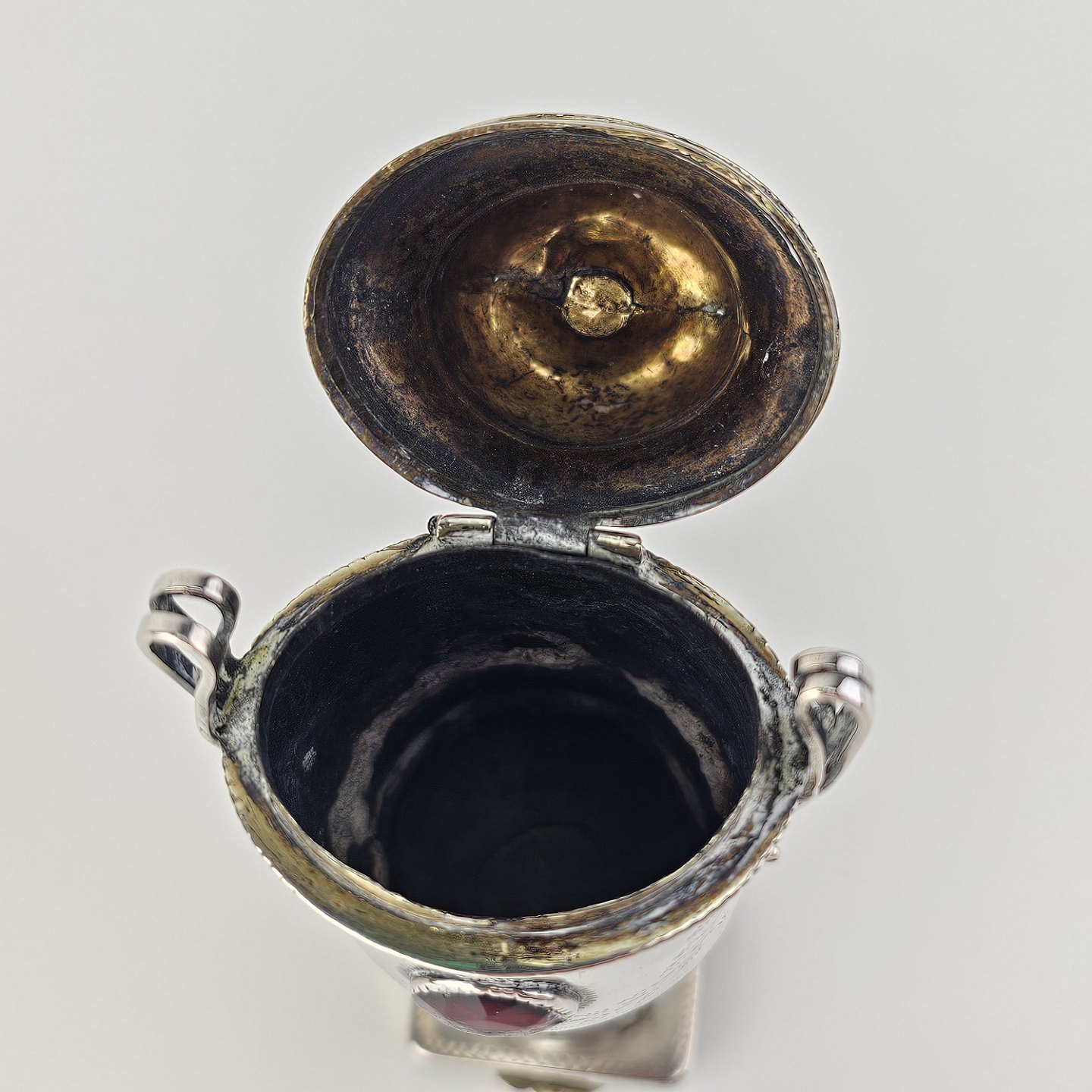 Hovedvandsæg i sølv dekoreret med forskellige smykkesten og bladværk