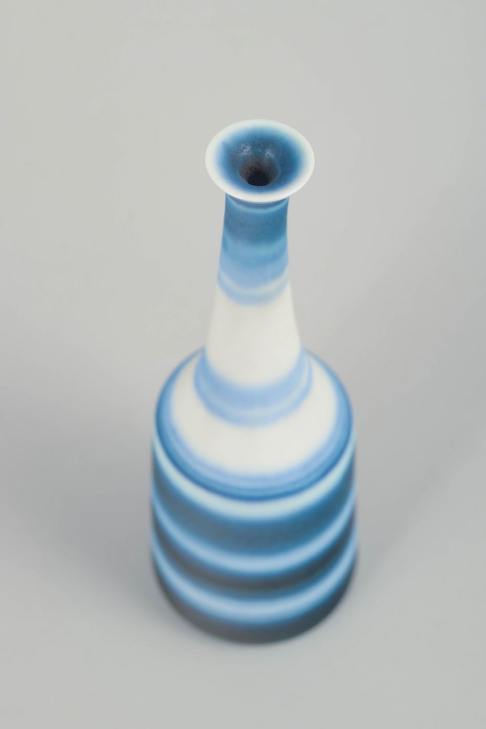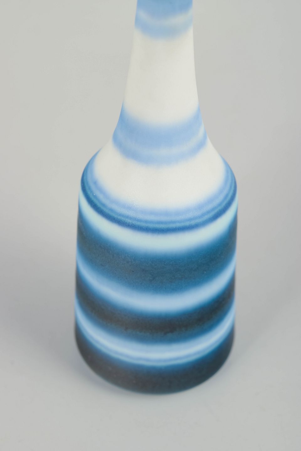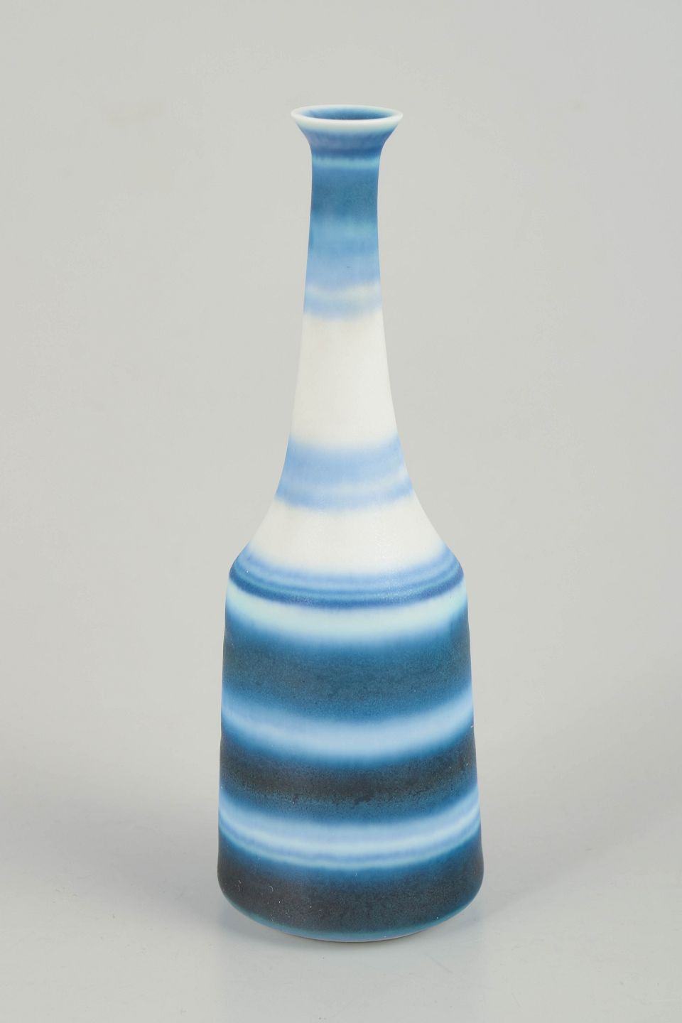 Slank miniaturevase i drejet stentøj med horisontale bånd i blå og hvide nuancer, udført i Nylunds karakteristiske glasurarbejde.