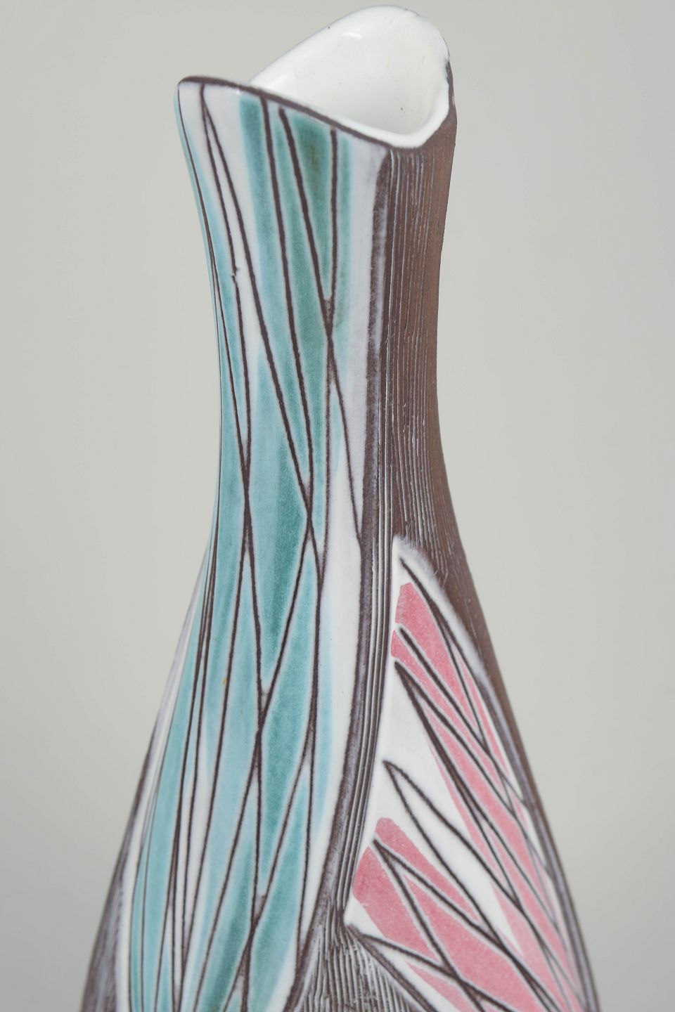 Slank figurativ vase model 4417 med stiliseret dekoration i brun, gul og rosa glasur med indridset linjearbejde.
