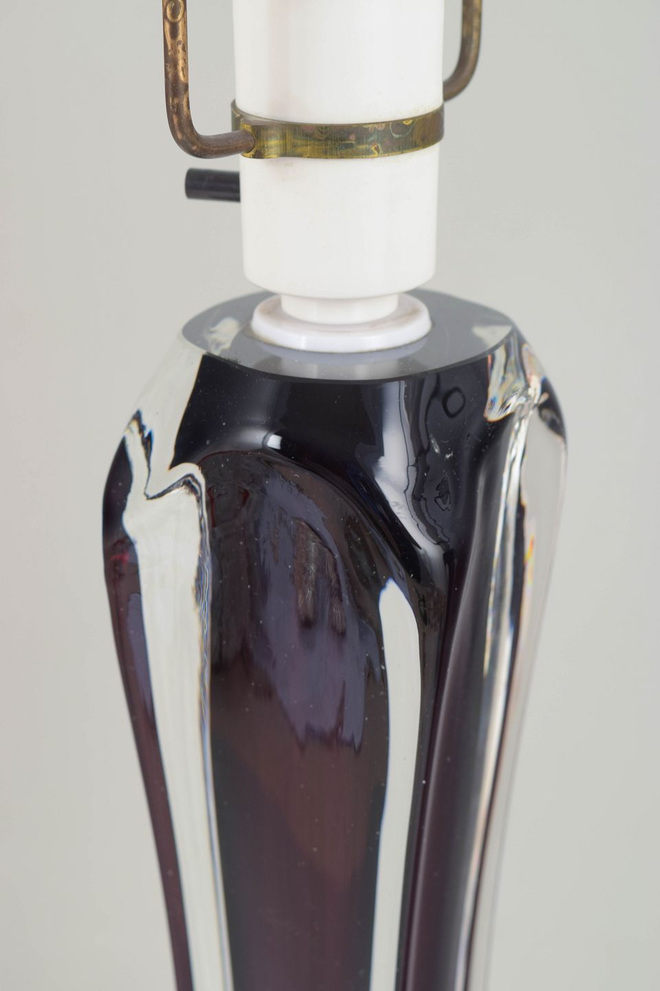 Sæt med to bordlamper i lilla kunstglas med facetslebne, høje former og klar fod. Klassiske fatninger i plast og messing, typisk for svensk glasdesign fra 1970’erne.
