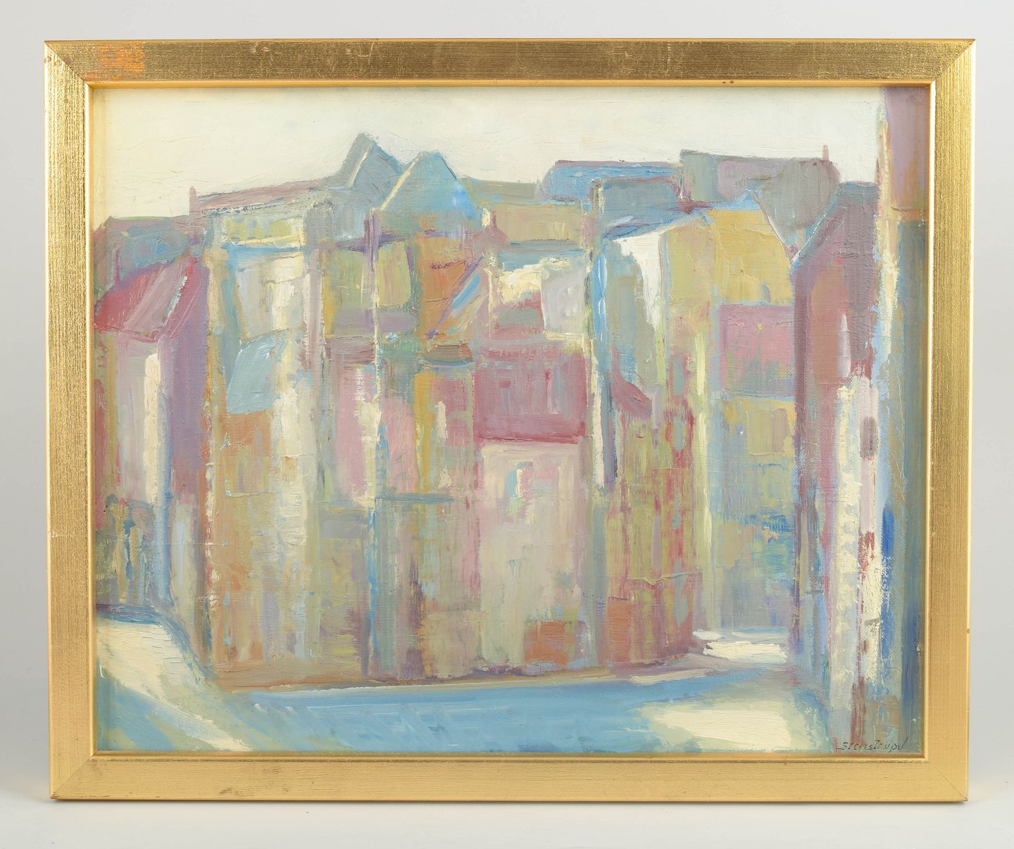 Modernistisk bymotiv udført i olie med forenklede arkitektoniske former og afdæmpet farveskala, signeret nederst til højre.