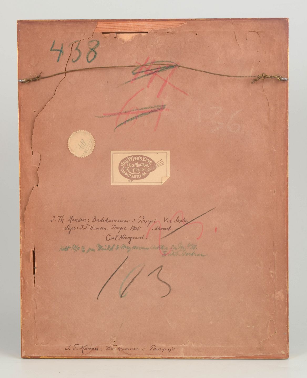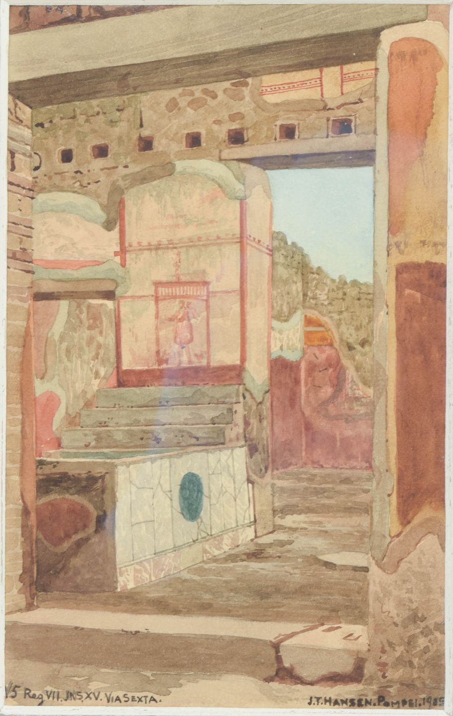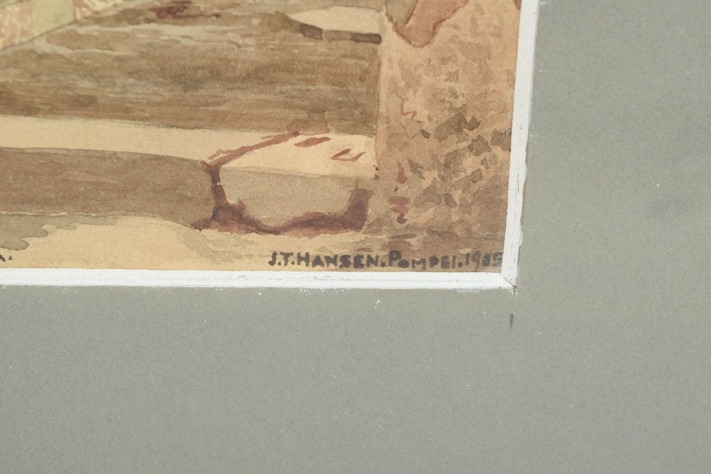 Arkitektonisk motiv fra Pompeji med klassiske bygningsfragmenter og rumlige perspektiver, udført som akvarel i dæmpede jordfarver og varme okkertoner. Signeret og dateret Pompeji 1905.