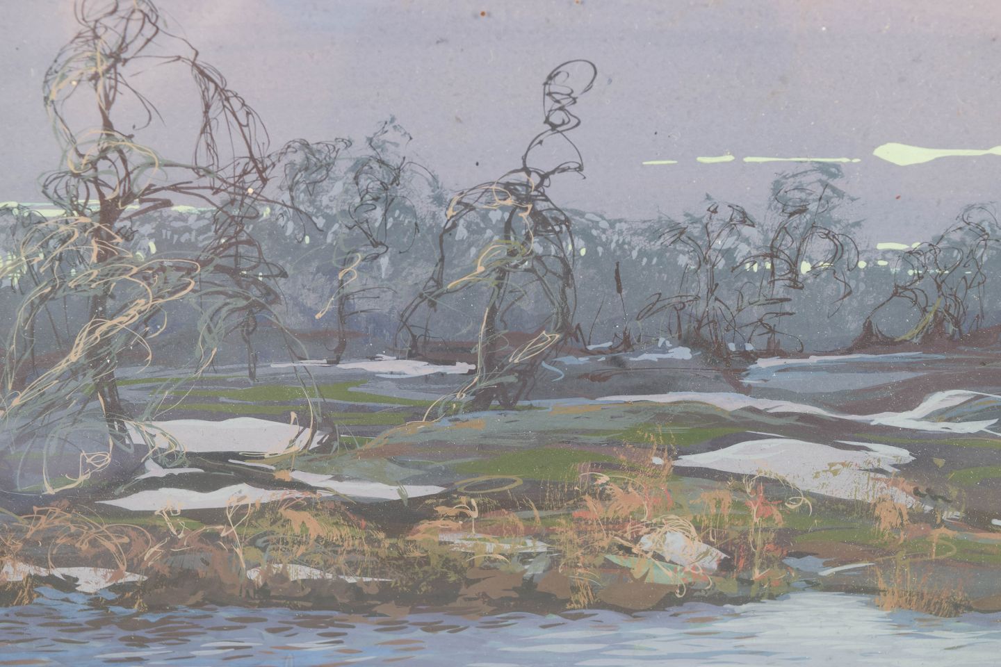 Landskabsmotiv med stiliserede træer og vandparti udført i gouache med afdæmpet, atmosfærisk farveholdning. Kompositionen fremstår malerisk med let abstraherede former og tydelig horisontal opbygning.
