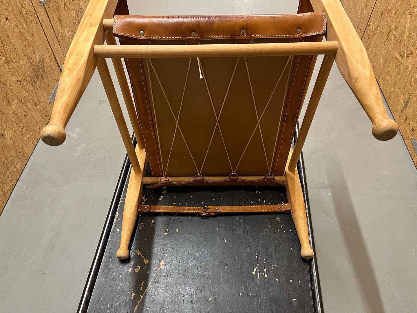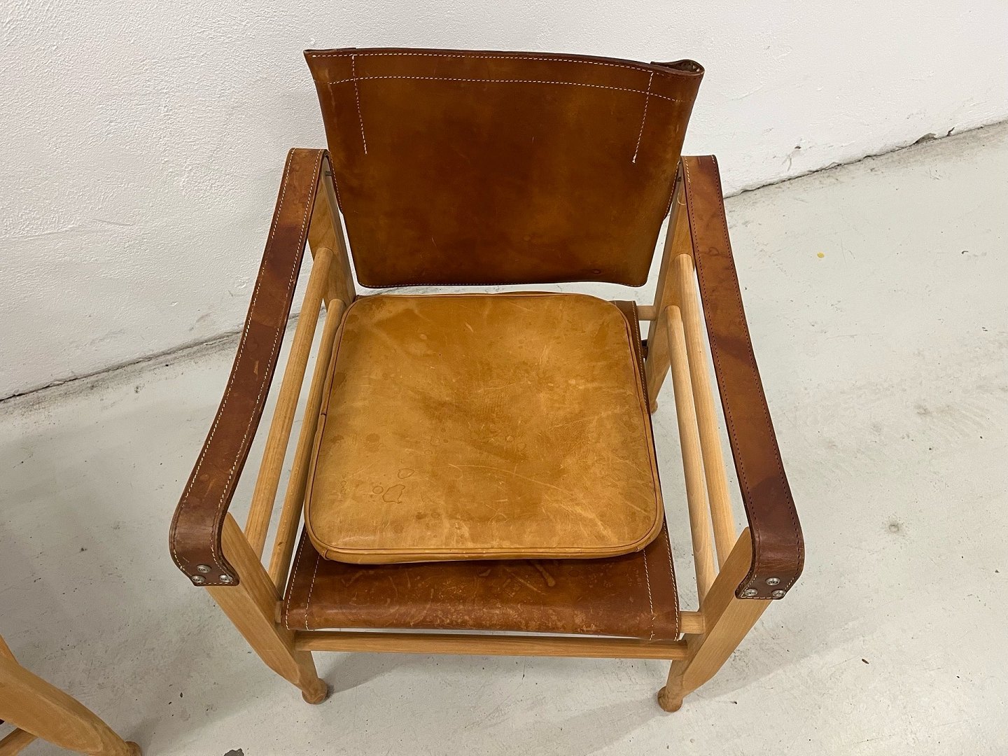 Aage Bruun & Søn – Safari-Stühle, 1960er Jahre. Ein absolut einzigartiges und außergewöhnlich gut erhaltenes Set Safari-Stühle von Aage Bruun & Søn aus den 1960er Jahren. Die Stühle bestehen aus einem Gestell aus massivem Buchenholz und sind mit cognacfarbenem, patiniertem Leder bezogen (Sitzfläche, Rückenlehne und Armlehnen). Das Leder weist eine wunderschöne Patina auf, und sowohl Schnallen als auch Riemen und Gestelle sind in makellosem Originalzustand. Die Stühle stammen aus einem Nichtraucherhaushalt ohne Haustiere und waren seit ihrer Anschaffung in Erstbesitz. Das Set besteht aus einem originalen Ledersofa und Kissen. Maße: Höhe: 67 cm – Breite: 55 cm – Tiefe: 57 cm – Sitzhöhe: 36 cm.