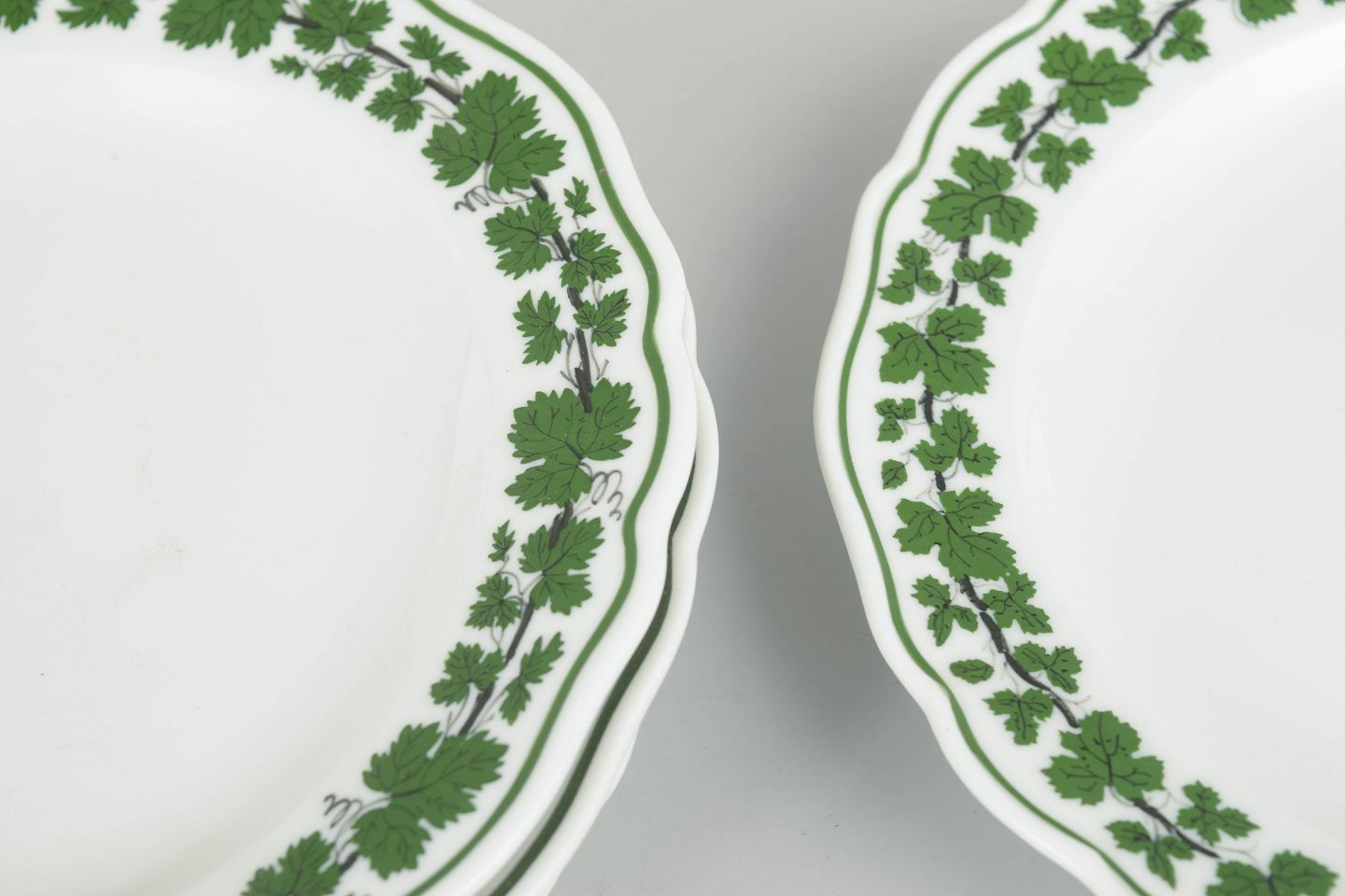 Runde porcelænstallerkener dekoreret med grøn vinløvsbort langs kanten. Nogle eksemplarer i første sortering, andre annulleret med fire indridsede streger. Mærket med Meissens krydsede sværd.