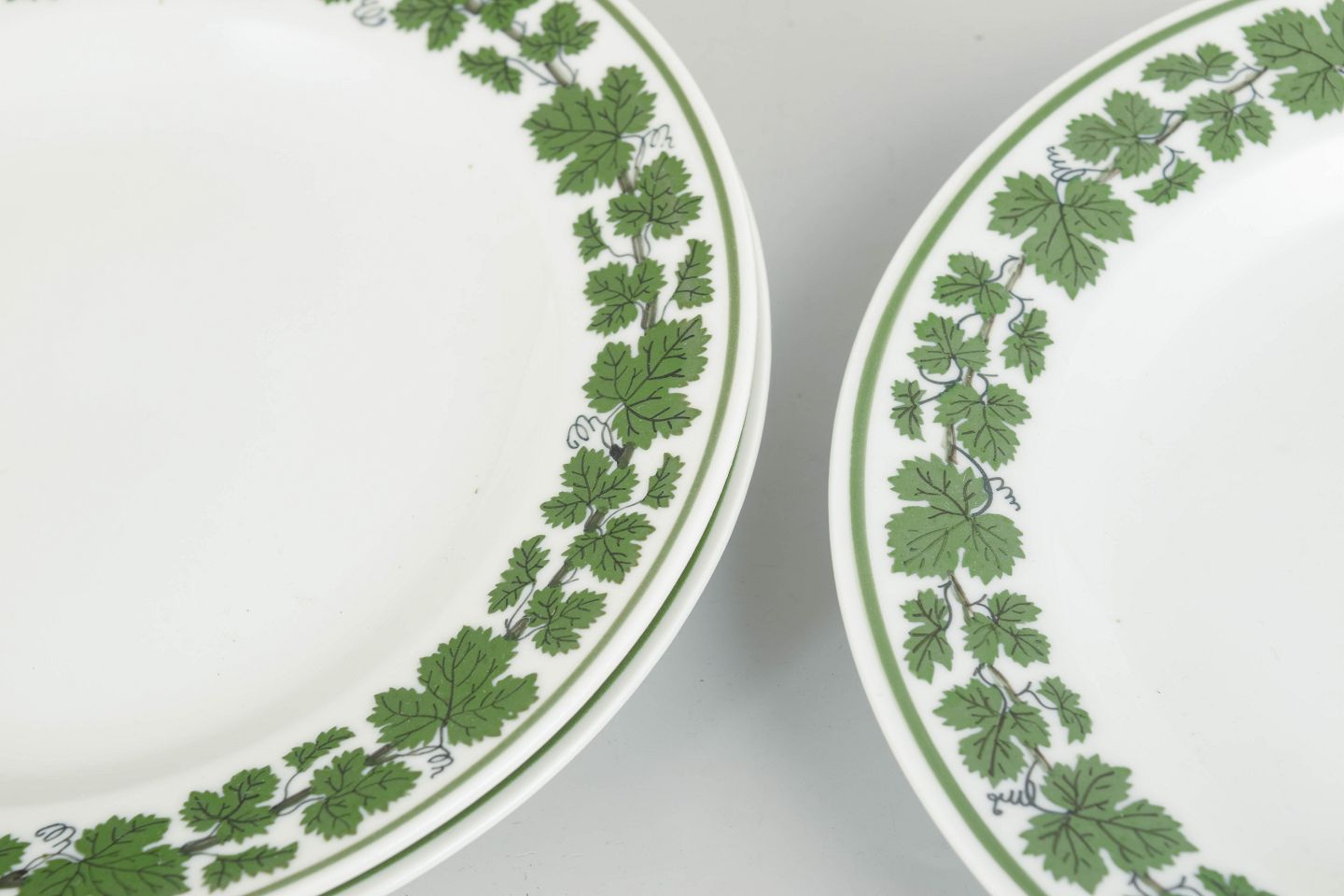 Runde porcelænstallerkener dekoreret med grøn vinløvsbort langs kanten. Første sortering, mærket med Meissen krydsede sværd.