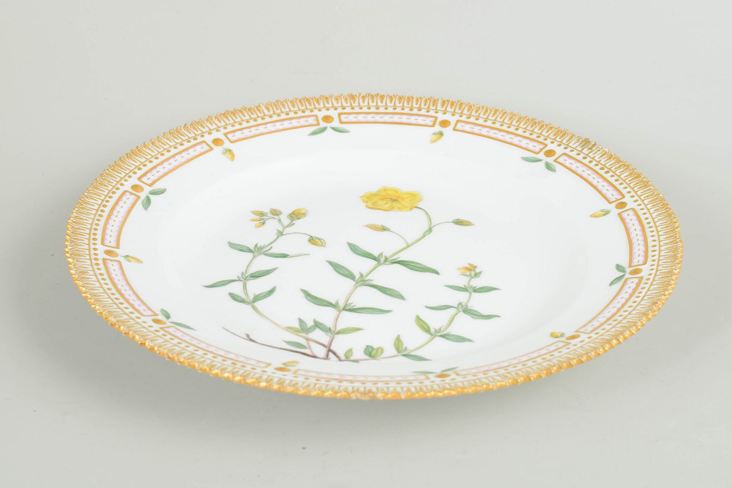 Middagstallerken i porcelæn med håndmalet botanisk motiv fra det eksklusive Flora Danica-stel, udført i naturalistiske farver og indrammet af rigt forgyldt bort.