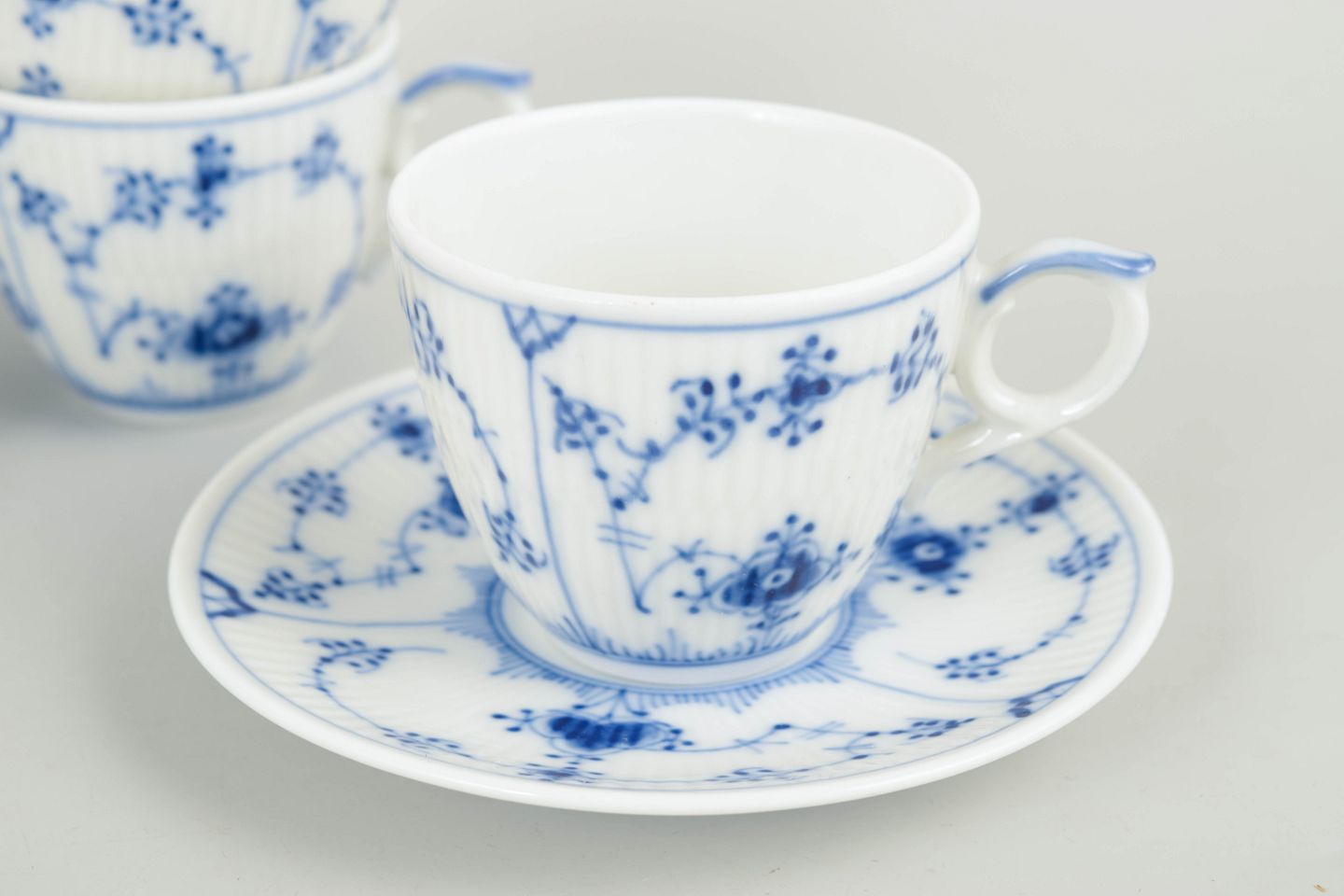Text zugänglich auf Dänische: Royal Copenhagen, Musselmalet riflet kaffekopper med tilhørende underkopper, sæt af 4.