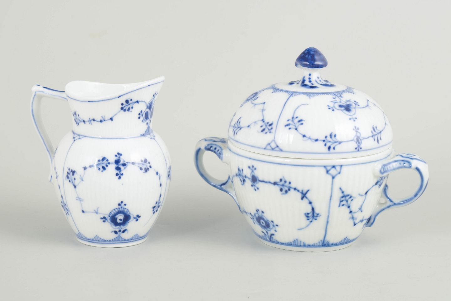 Flødekande og sukkerskål i håndmalet underglasurblå dekoration i det klassiske Musselmalet riflet-stel. Flødekande model 1/60 og sukkerskål model 1/244.