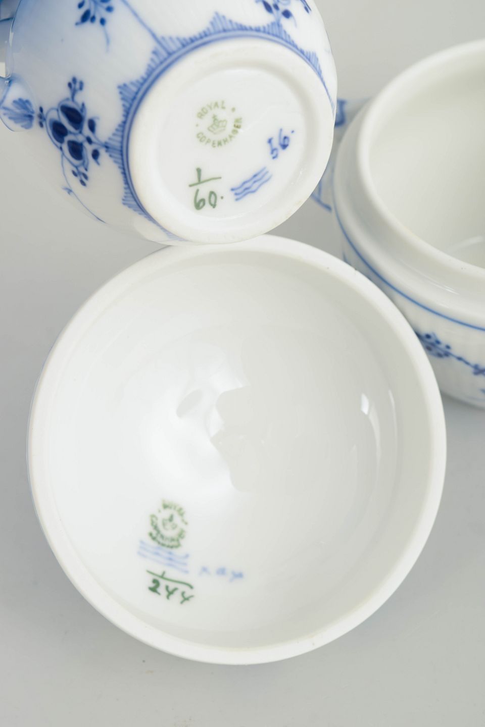 Musselmalet riflet er Royal Copenhagens ældste stel, introduceret i 1775. Dekorationen udføres i frihåndsmalet kobolt under glasuren, hvilket giver naturlige variationer i streg og farveintensitet. Omkring år 1900 var stellet en fast del af både daglig brug og mere formelle opdækninger og repræsenterer klassisk dansk porcelænshåndværk med dybe historiske rødder.