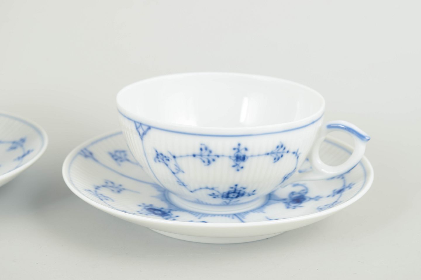 To tekopper med tilhørende underkopper i håndmalet underglasurblå dekoration i det klassiske Musselmalet riflet-stel. Kopper model 078, underkopper model 082. Annulleret med én indridsning.
