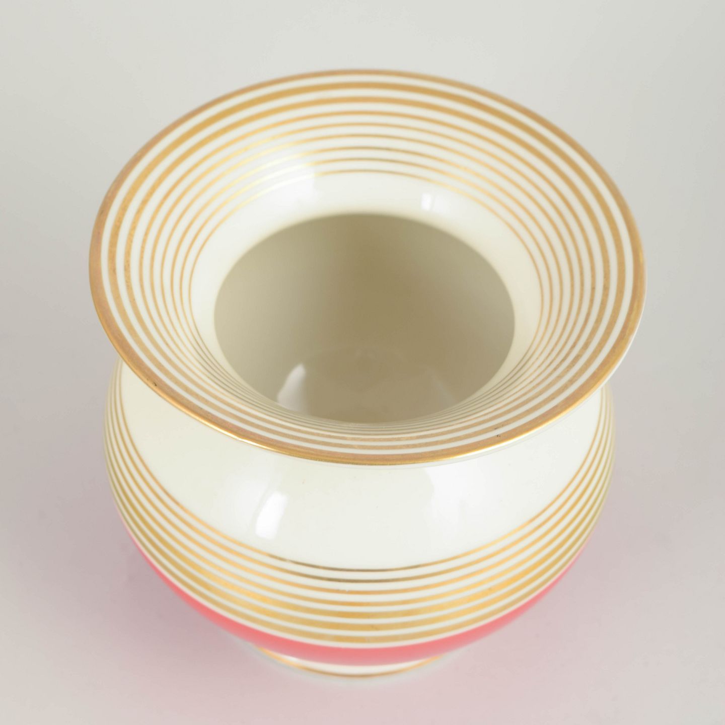 Art deco–formet porcelænsvase med balusterkrop, flad fod og udadbøjet munding. Dekoreret med brede horisontale bånd i rød og elfenbenshvid med forgyldte linjer. Underglasur fabriksstempel “Johann Seltmann Vohenstrauss Bavaria” under bunden.