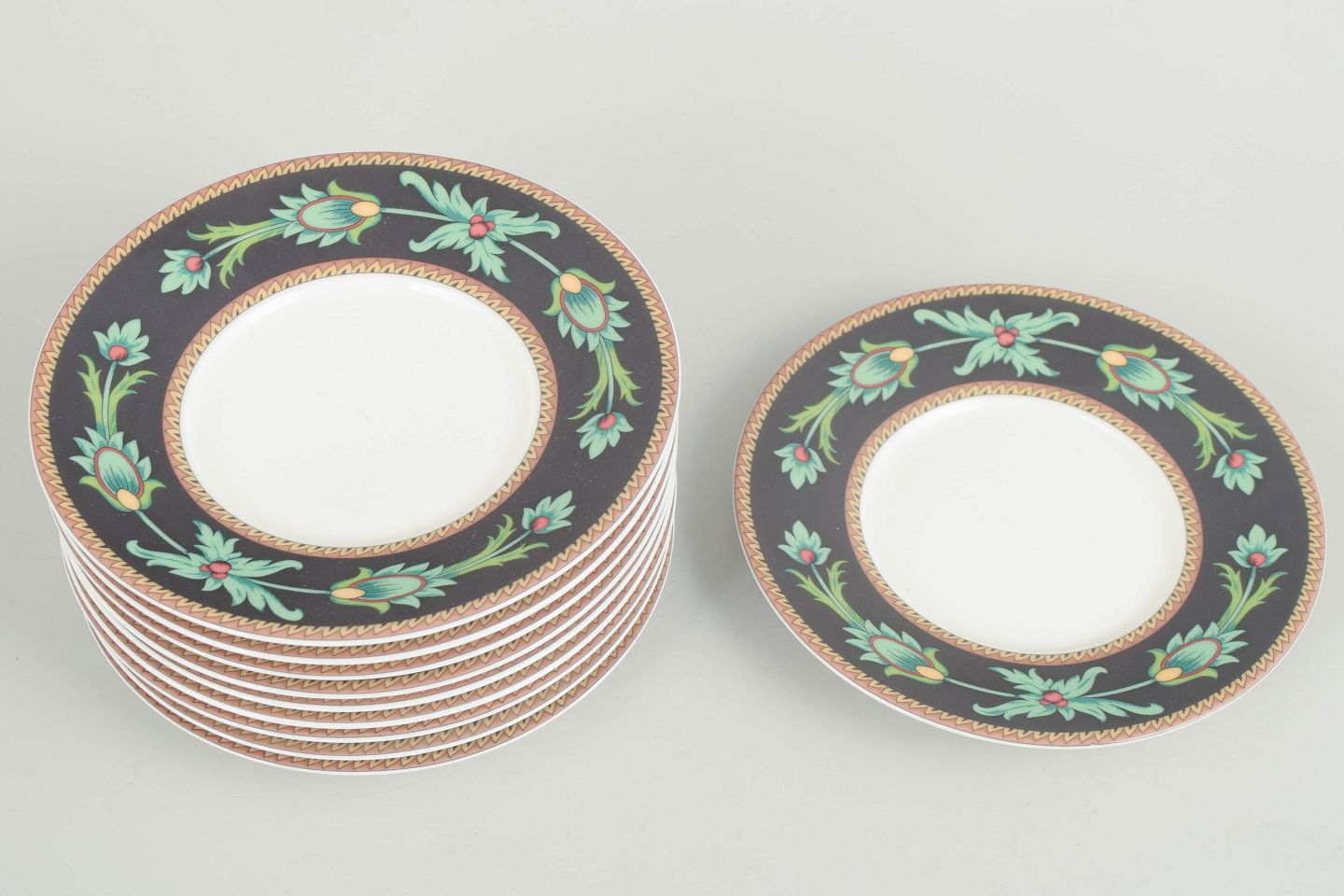 Sæt med ti små runde fade i porcelæn fra Rosenthal Classic, dekoreret i serien Mayfair med mørk bort, stiliserede grønne bladranker og gulddetaljer, produceret i 1980’erne.