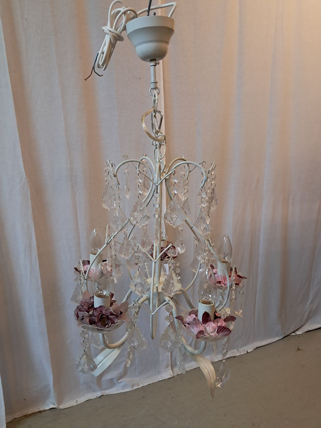 Malet lysekrone i metal med plastprismer, fra 1990erne.