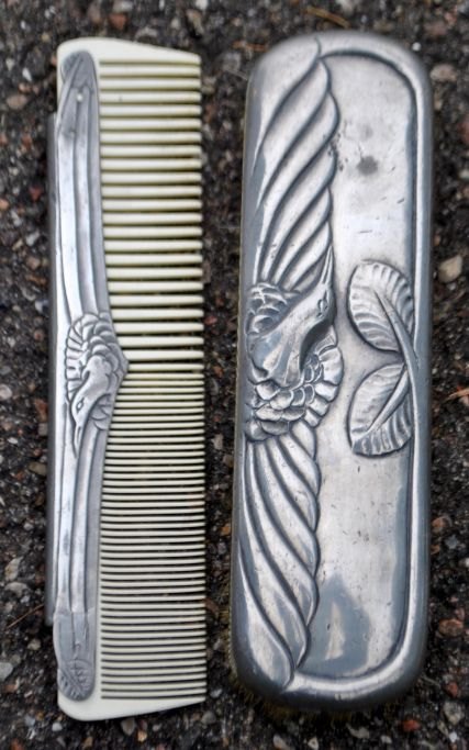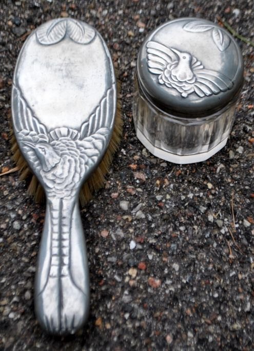 Hertz/Mogens Ballin Toilettenset aus Zinn, Art déco, Entwurf 1719. Um 1920. Kopenhagen, Dänemark. Bestehend aus Spiegel, Kamm, zwei Bürsten und einem Gefäß mit Deckel. Verziert mit Kranich und Blattwerk. Spiegellänge: 33 cm. Gestempelt.