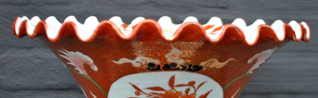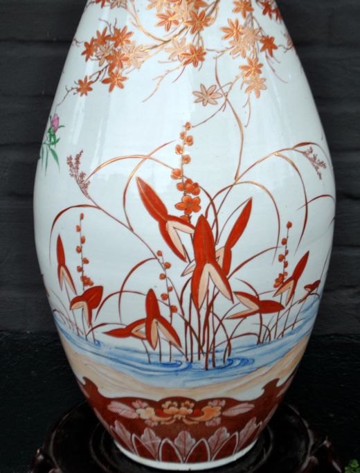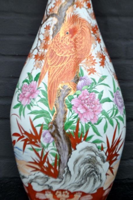 Japanische Kutani-Vase, 19. Jahrhundert. Handbemalt. Verziert mit Motiven wie Bäumen, Blumen und Vögeln. Polychrome Bemalung mit Vergoldung. Wellenrand. Höhe: 94 cm. Durchmesser: 33,5 cm. Höhe inkl. Fuß: 113,5 cm.