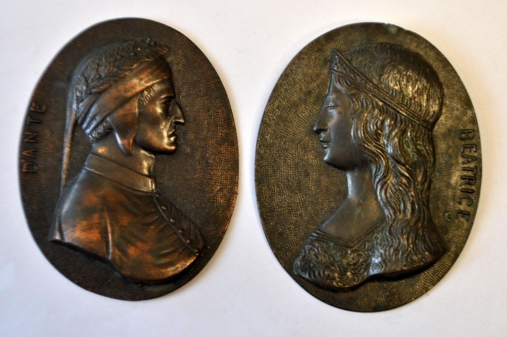 Zwei ovale Reliefs von Dante und Beatrice, 19. Jahrhundert. Italien. Metall. 11,5 x 9 cm. Zum Aufhängen.
