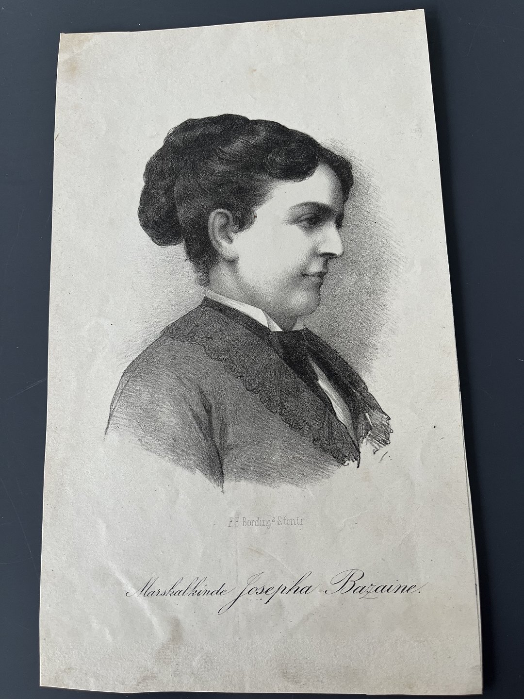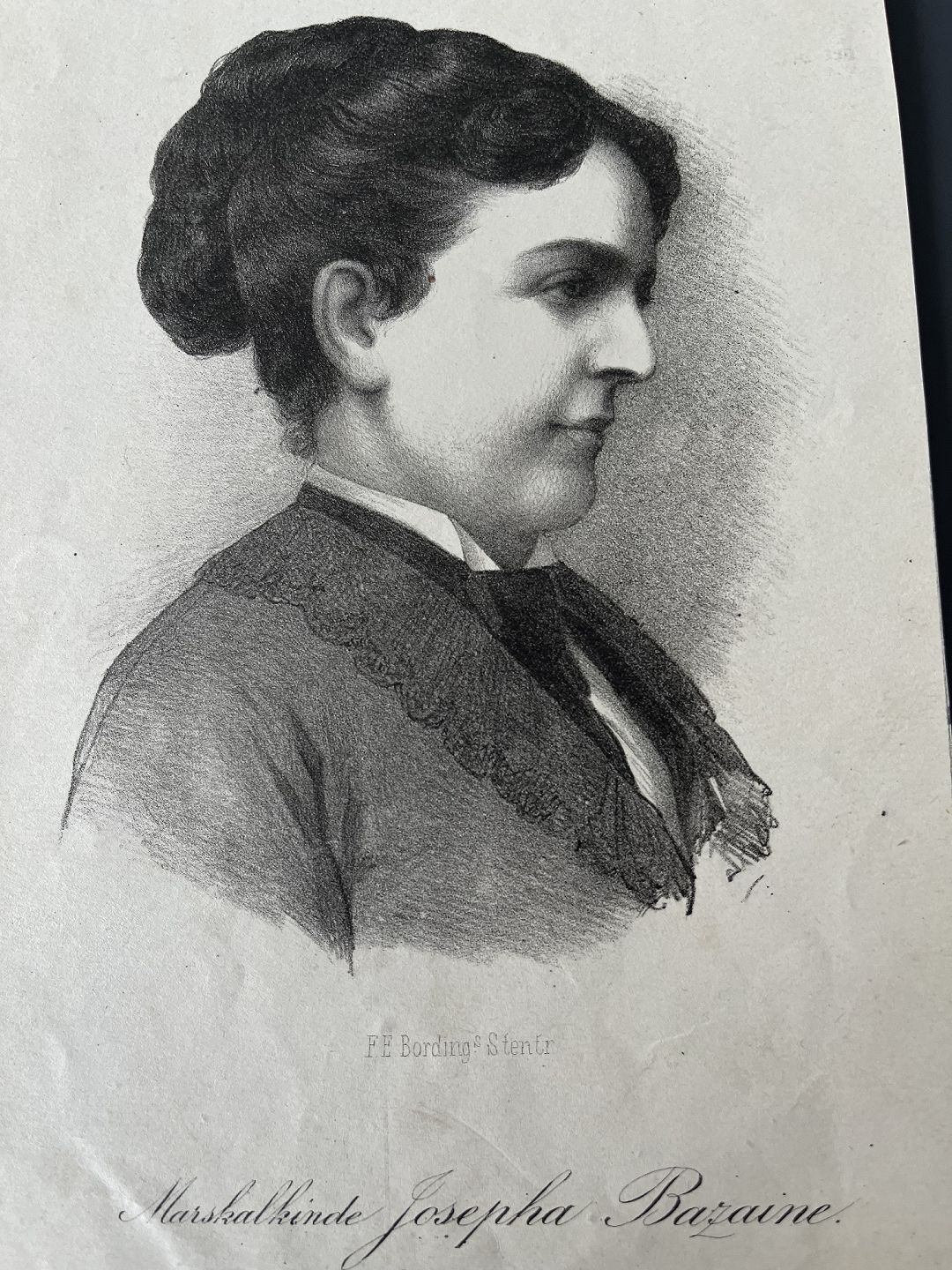 Text zugänglich auf Dänische: Litografi af F.E. Bording - Portræt af Marskalinde Josepha "Pepita" Bazaine 1874,