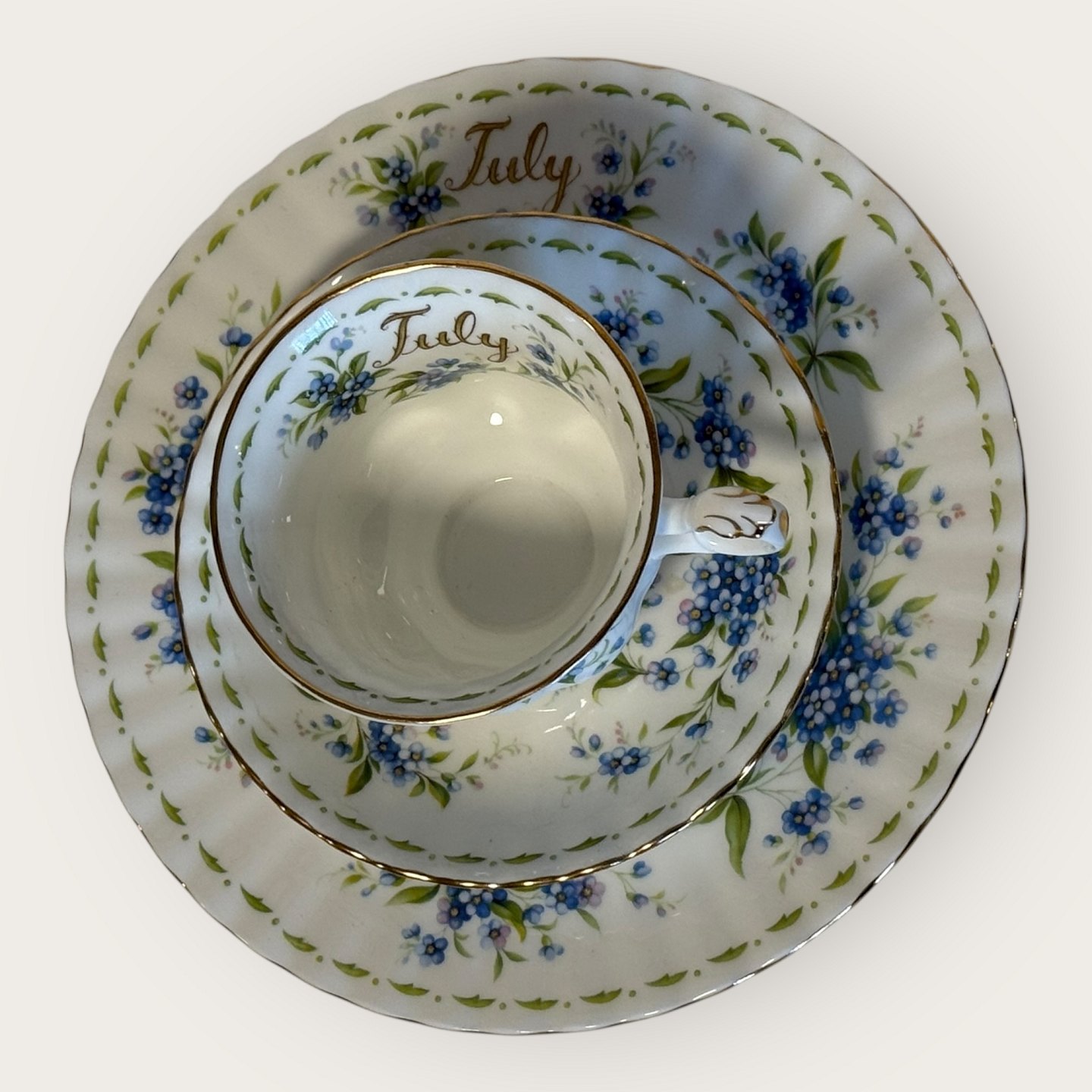 Royal Albert, Blume des Monats, Trio-Set bestehend aus Tasse, Untertasse und Kuchenplatte; Teller: Durchmesser 20,5 cm, Tasse: Durchmesser 9 cm, Höhe 7 cm. *In einwandfreiem Zustand