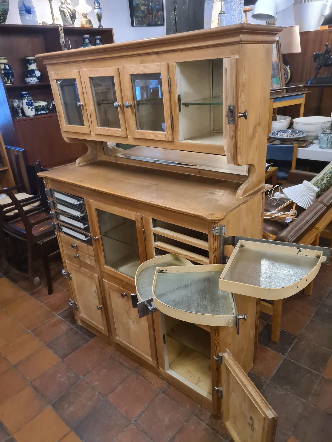 Text zugänglich auf Dänische: Ældre originalt tandlægeskab i fyrretræ med låger og hylder i glas og metal.