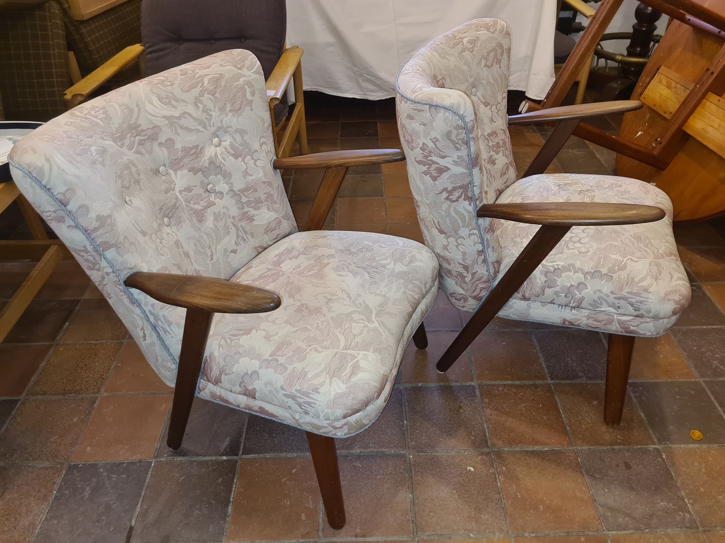 Text zugänglich auf Dänische: Erhardsen & Andersen par lænestole med stel i teak, betrukket med møbelstof.