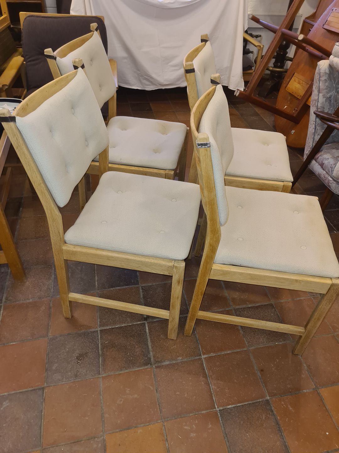 Text zugänglich auf Dänische: Kurt Østervig sæt af 4 spisebordsstole udført i massiv eg, samt hynder i stof.