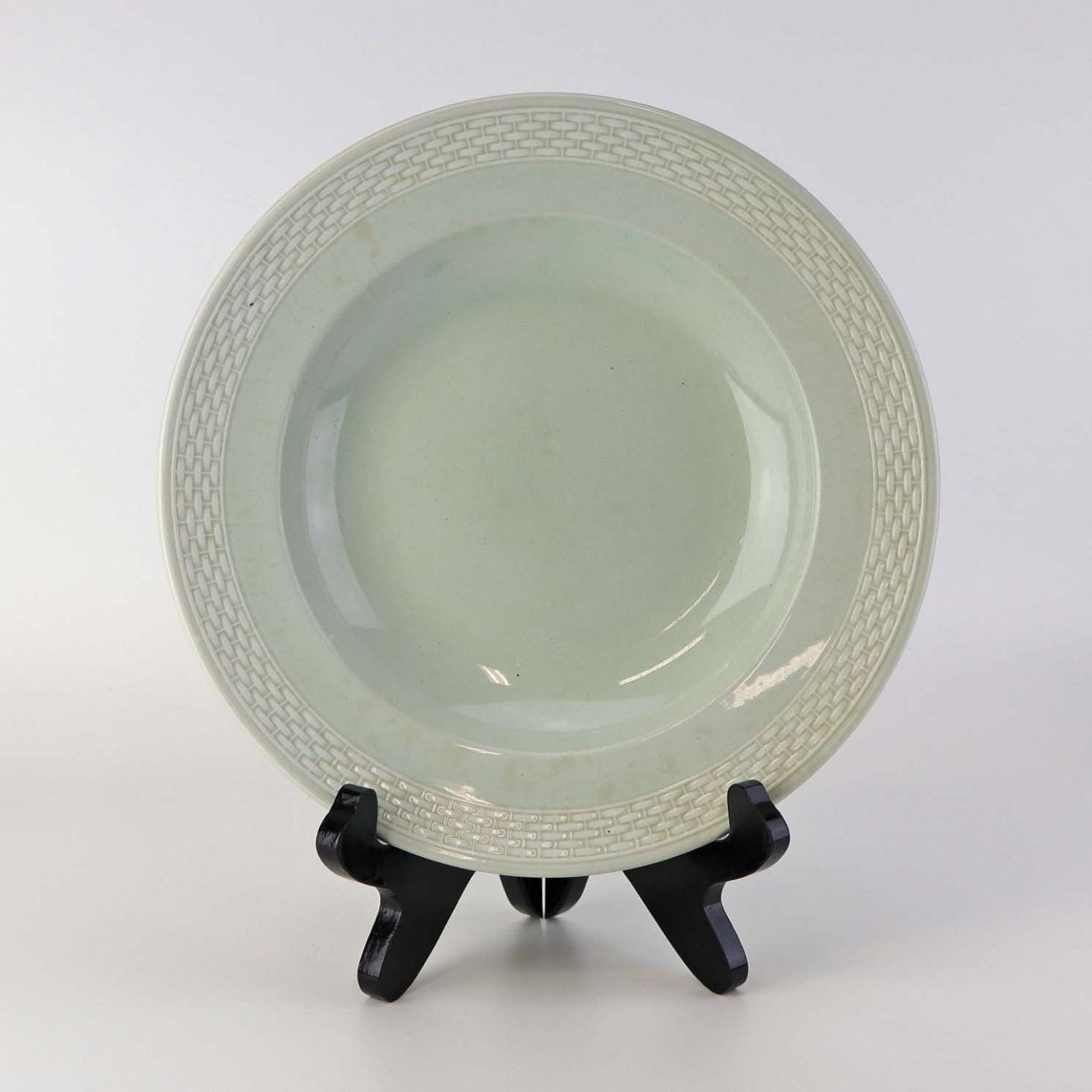 Fajancestel i stelform Viktoria II med fletværk i en lys mintgrøn farve med flettet dekoration langs kanten.