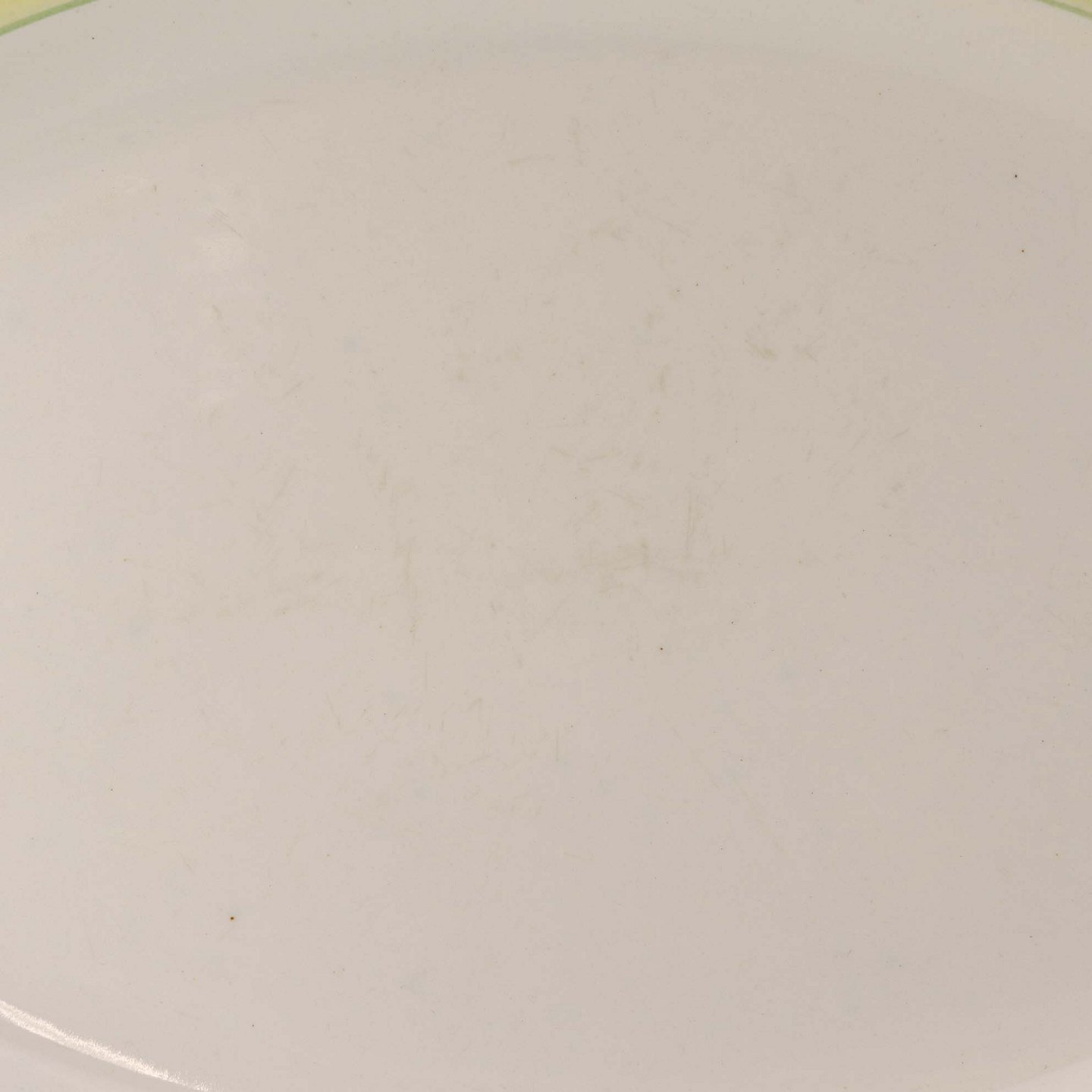 Fajancestel med gul dekoration på lys baggrund og med vissengrøn streg.