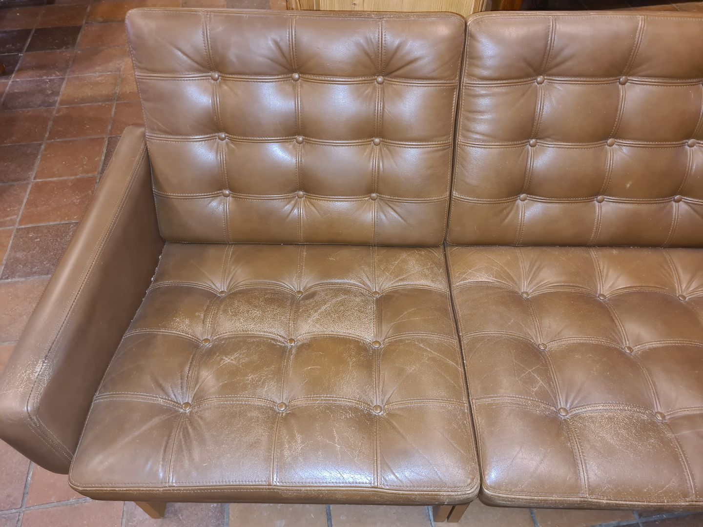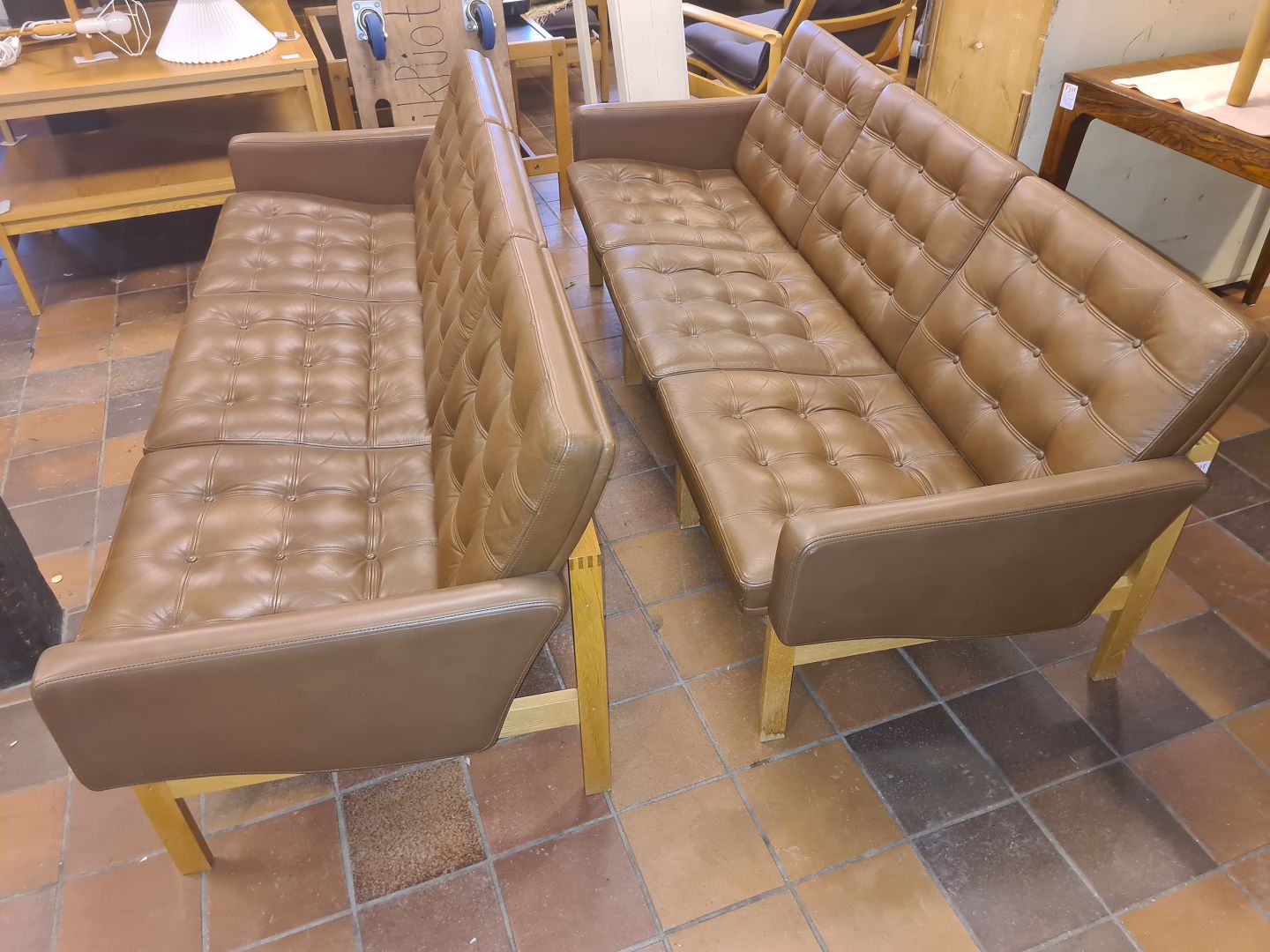 Text zugänglich auf Dänische: Par 3 personers sofaer i eg og læder designet af Ole Gjerlev Knudsen Moduline model. Fremstillet i 1970'erne. Fremstår står pæne og ok velholdte dog med lidt overfladiske brugsspor på den ene og mindre hul i sæde på den anden. (Billeder)
