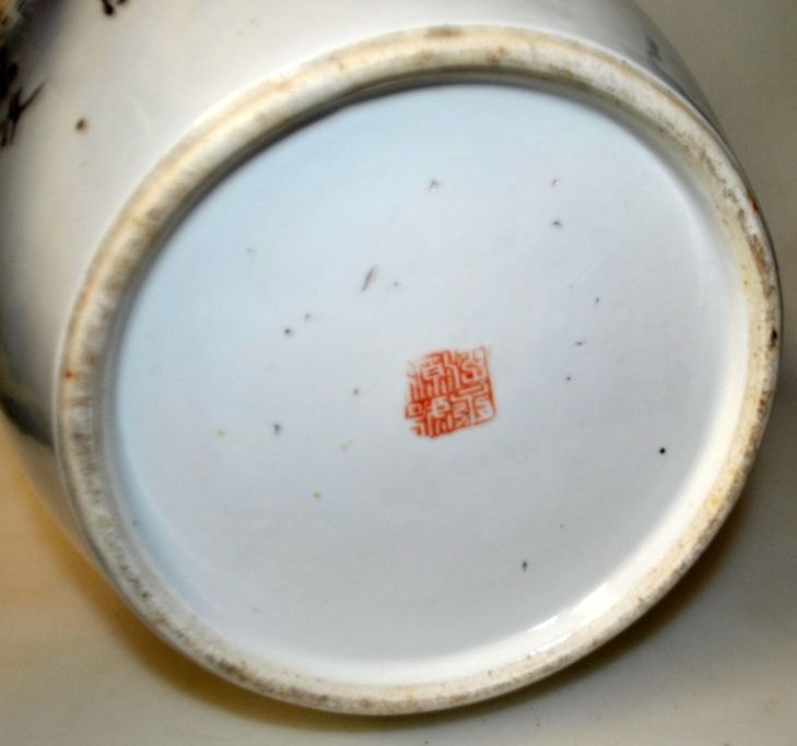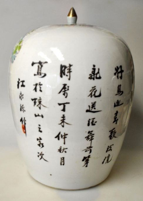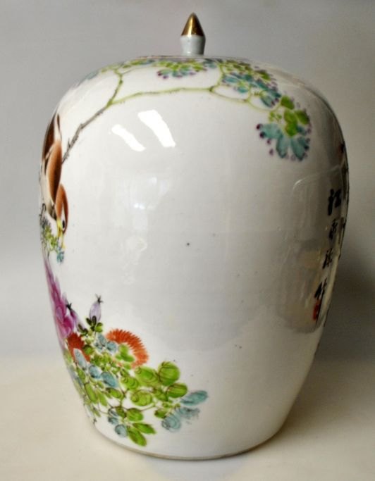 Chinesisches Deckelgefäß, 19. Jahrhundert. Handbemalt. Polychrome Dekoration mit Vögeln, Blumen und Schriftzug. Mit Deckel und Knauf. Signiert. Höhe: 32 cm.