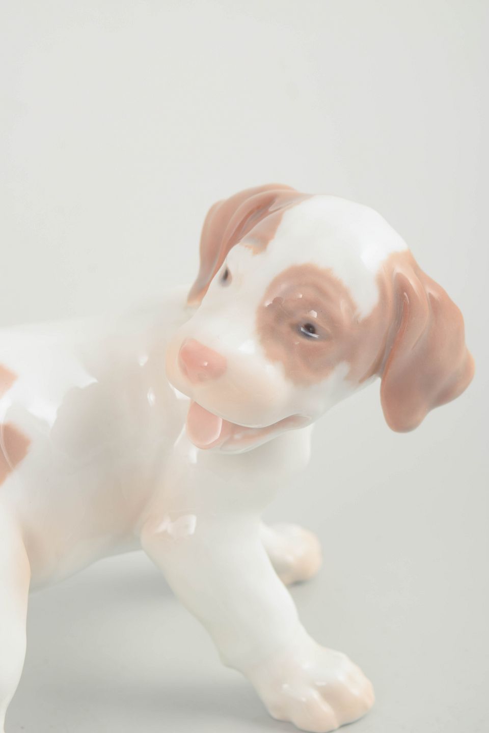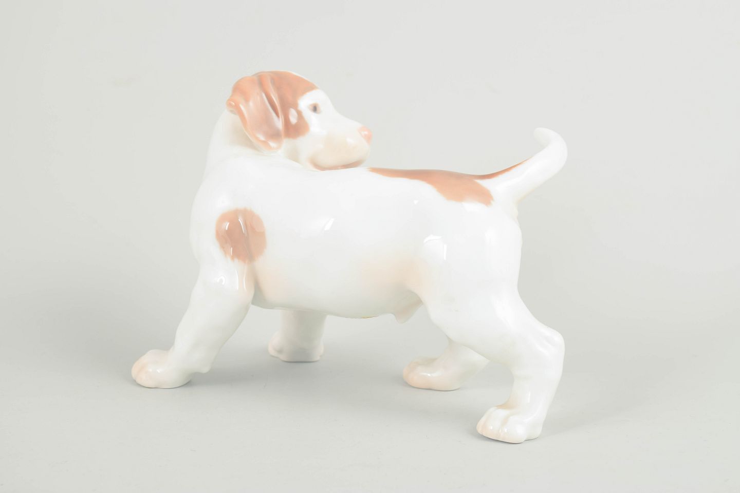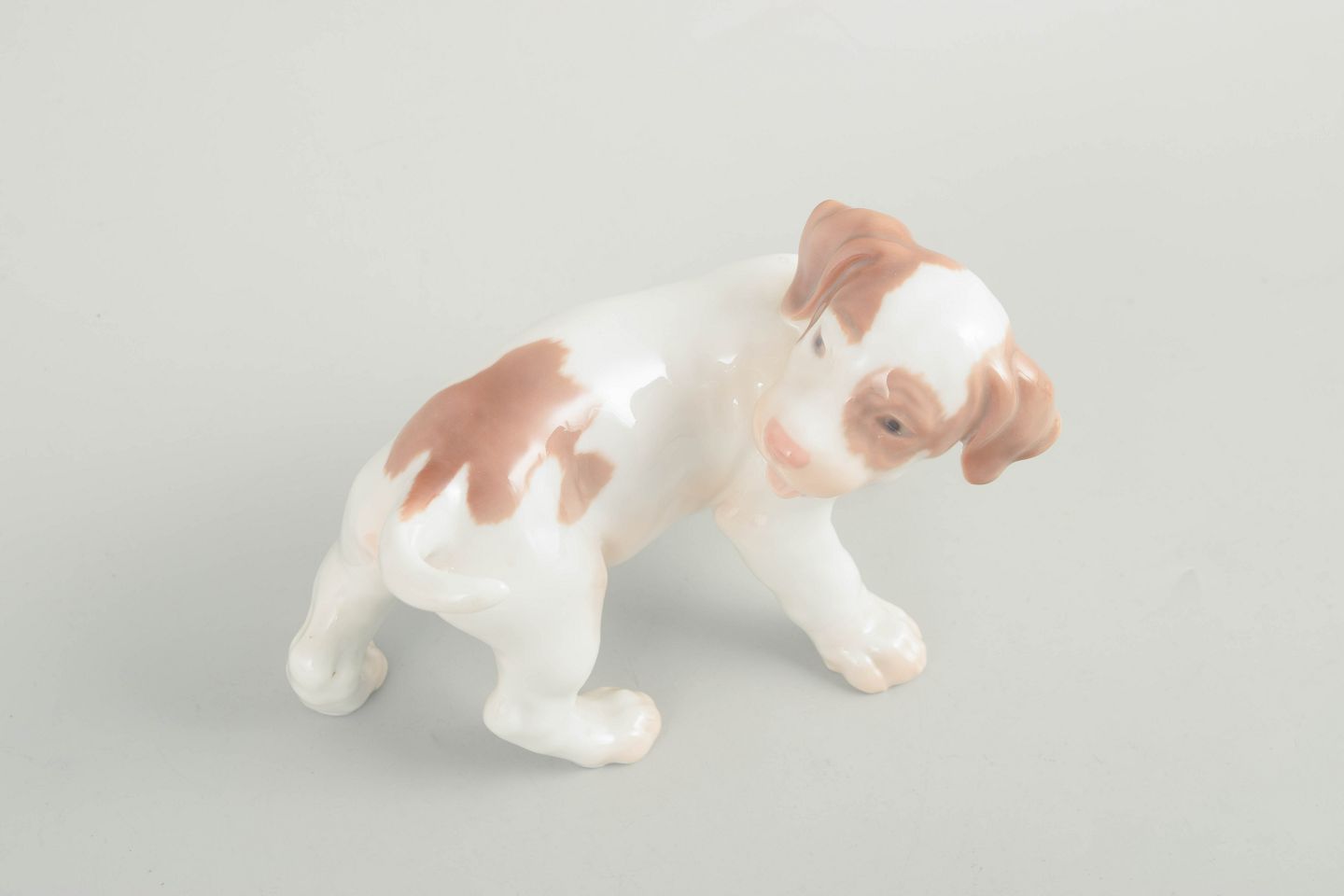 Naturalistisk modelleret porcelænsfigur forestillende en stående hvalp med bløde former og håndmalet dekoration i lysebrune og cremefarvede nuancer. Model 2026.