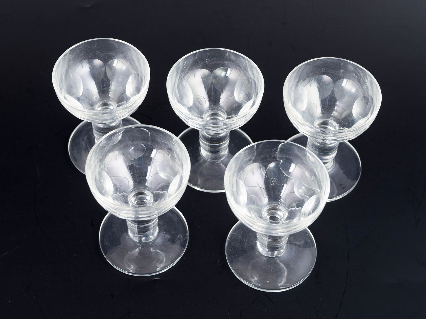Sæt med 5 små facetslebne snapseglas i klart krystalglas med kraftig fod og skålformet cupe, udført i en klassisk skandinavisk stil. Ca. 1940’erne.